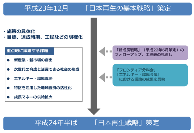 現在、さらに個別の課題について掘り下げ、目標や達成時期、工程などを明らかにした「日本再生戦略」の策定に向けて、議論を進めています