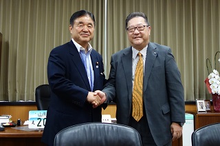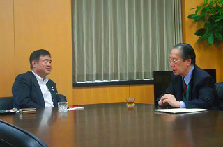 8月20日(木)、JXホールディングス株式会社名誉顧問の渡文明さんが遠藤大臣を訪ね、意見交換を行いました。渡さんは、政府の行政改革推進会議のメンバーであるとともに、民間資金等活用事業推進機構 代表取締役社長も務めています。