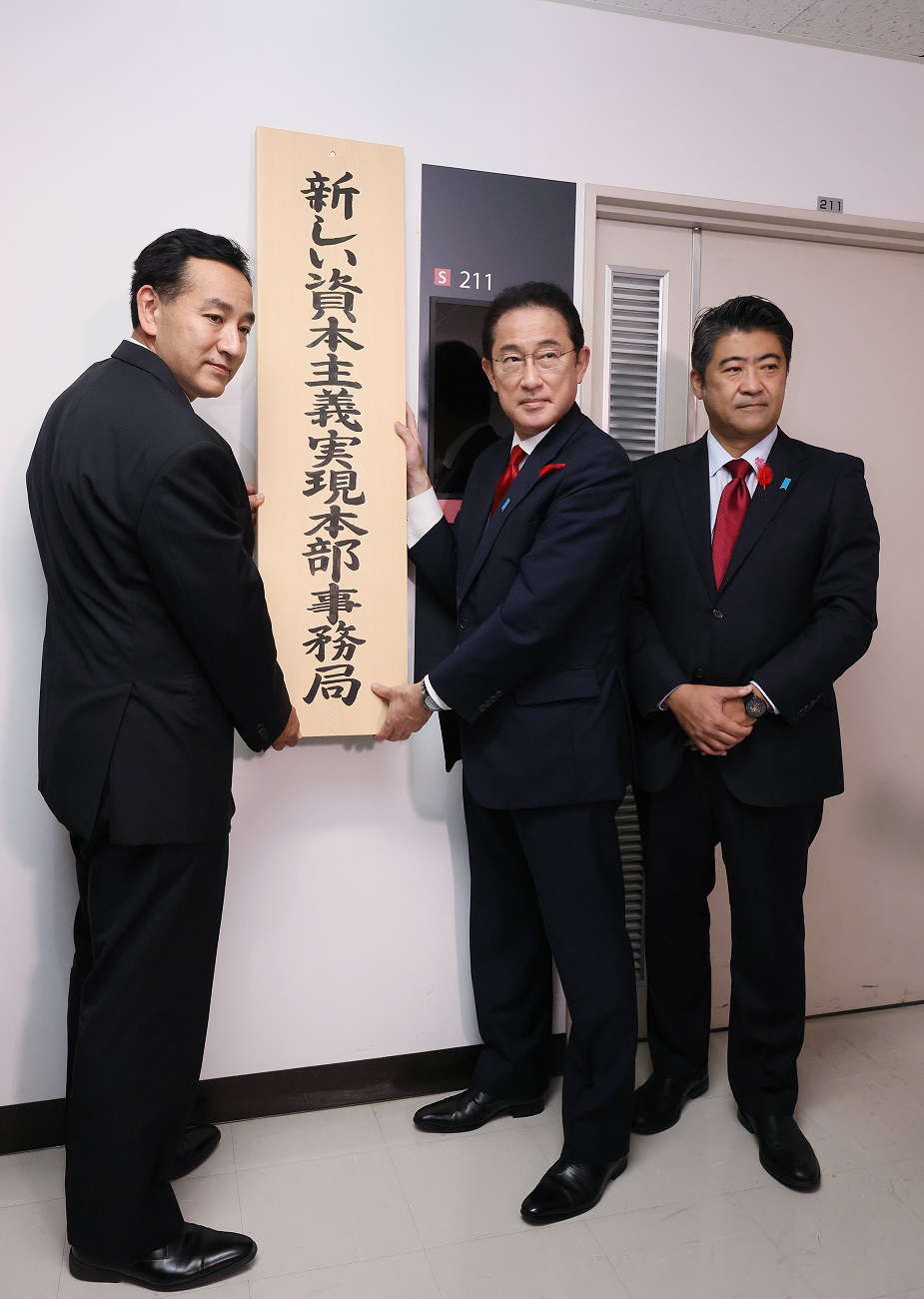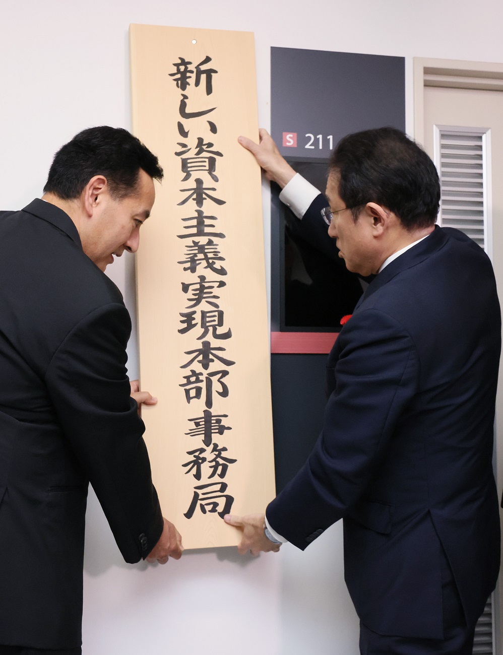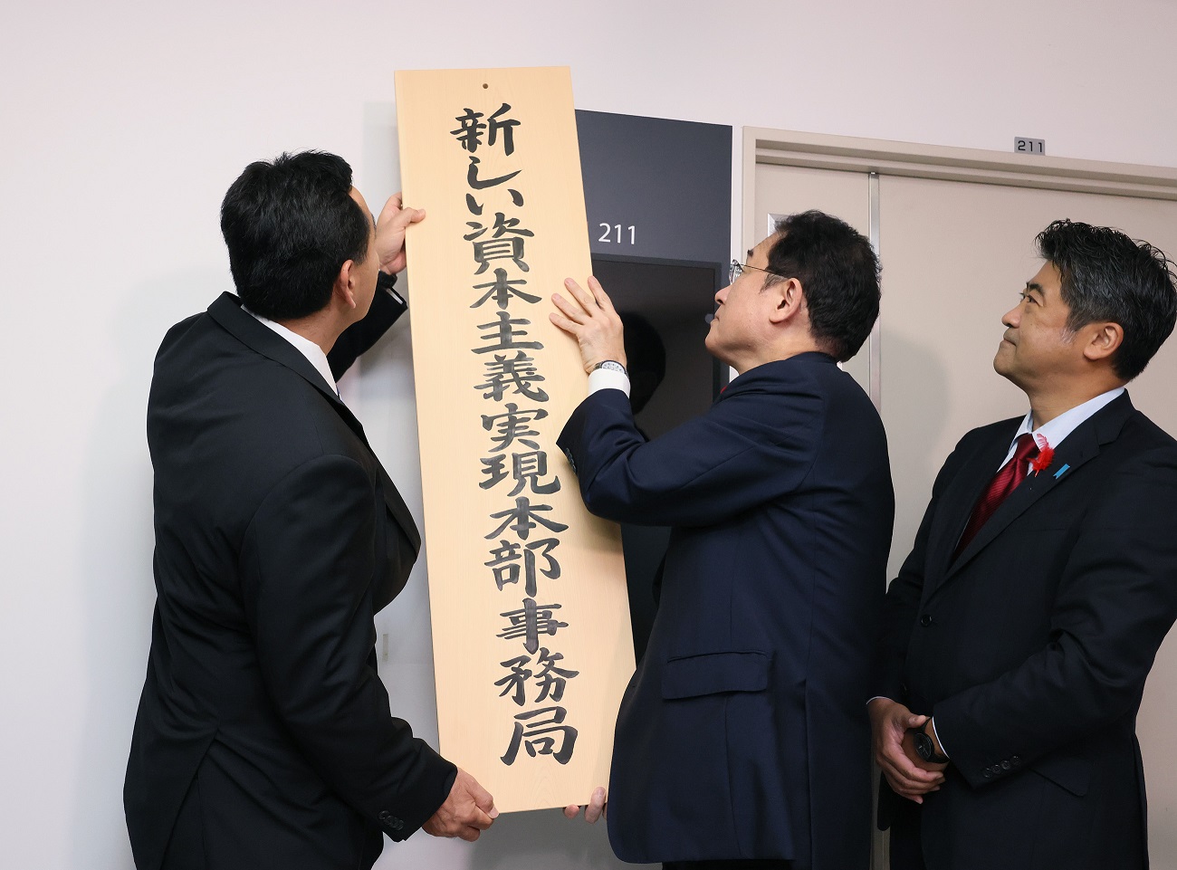 岸田总理举行了设置实现新资本主义本部事务局的挂牌仪式。
