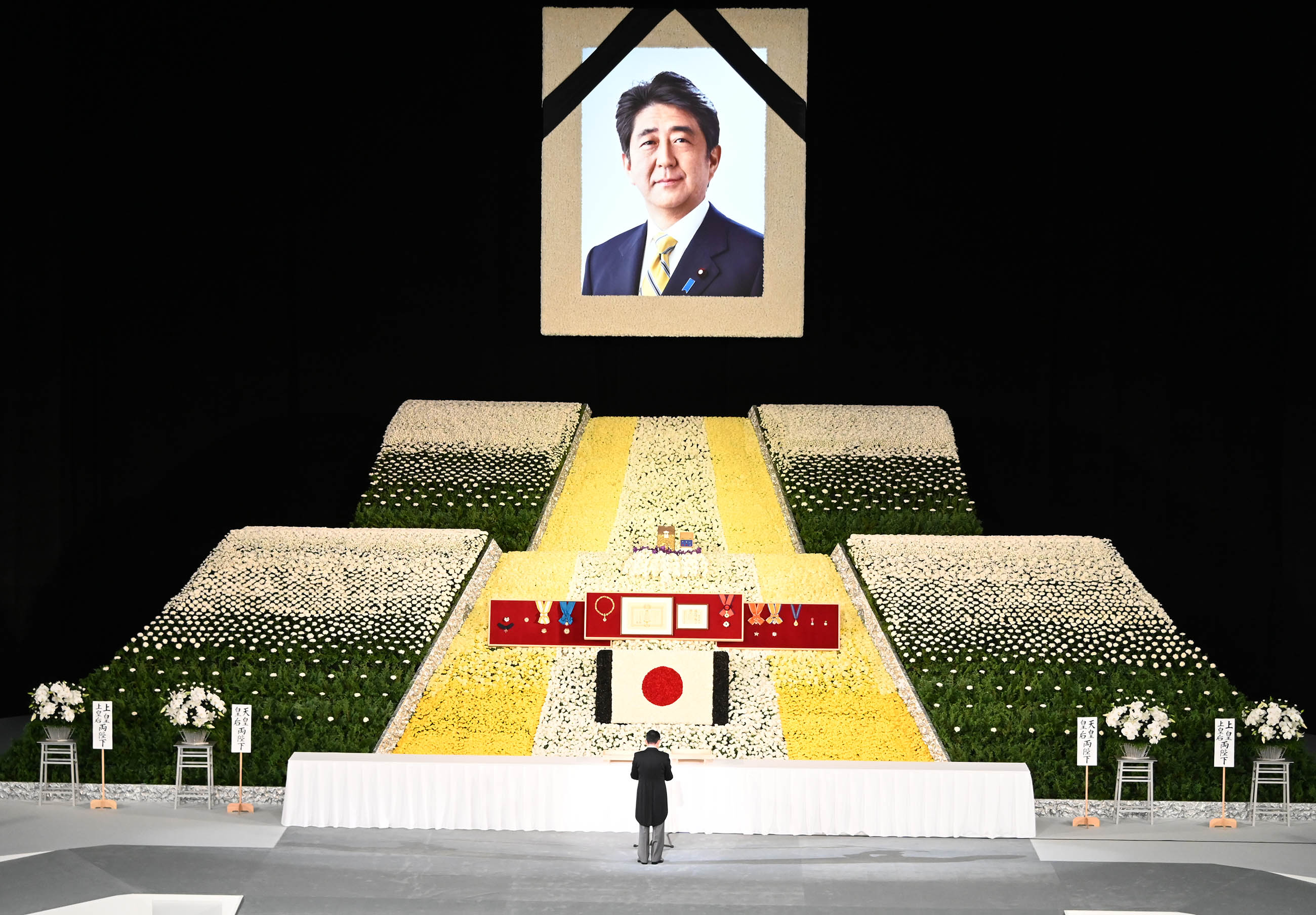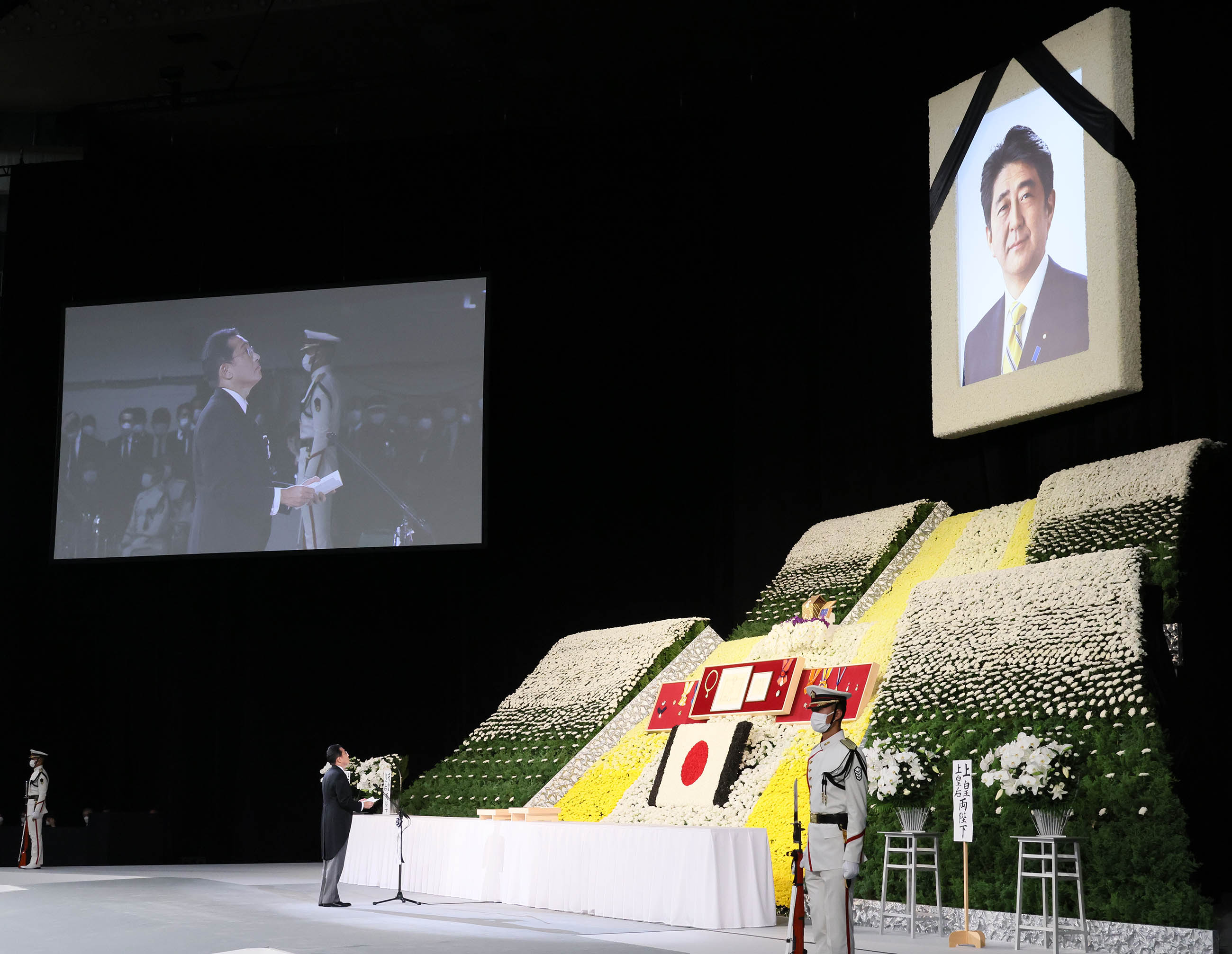 从一位、大勋位菊花章颈饰之安倍晋三前首相的国葬典礼于今日举行,本人在此谨代表政府献上悼词。