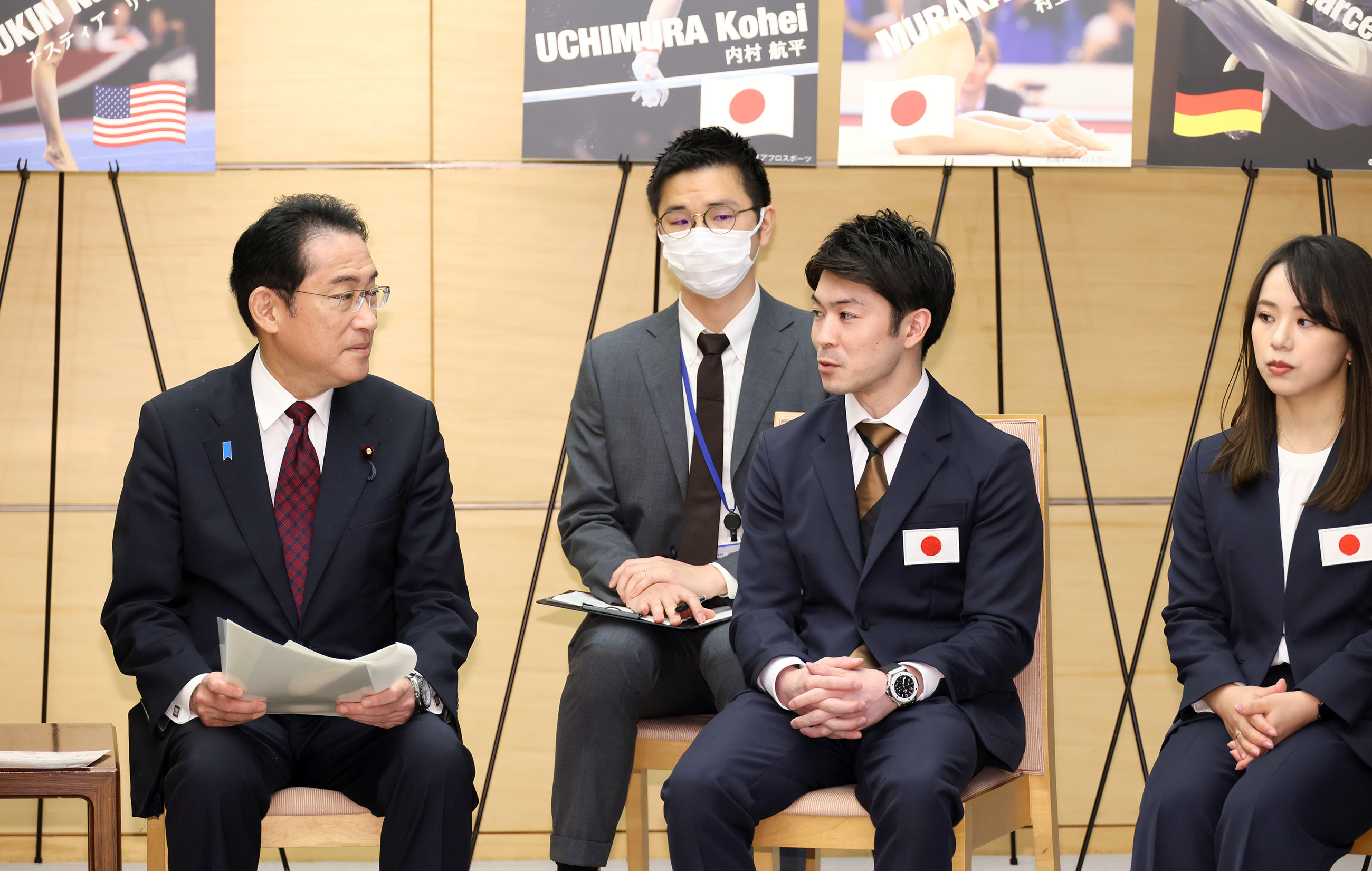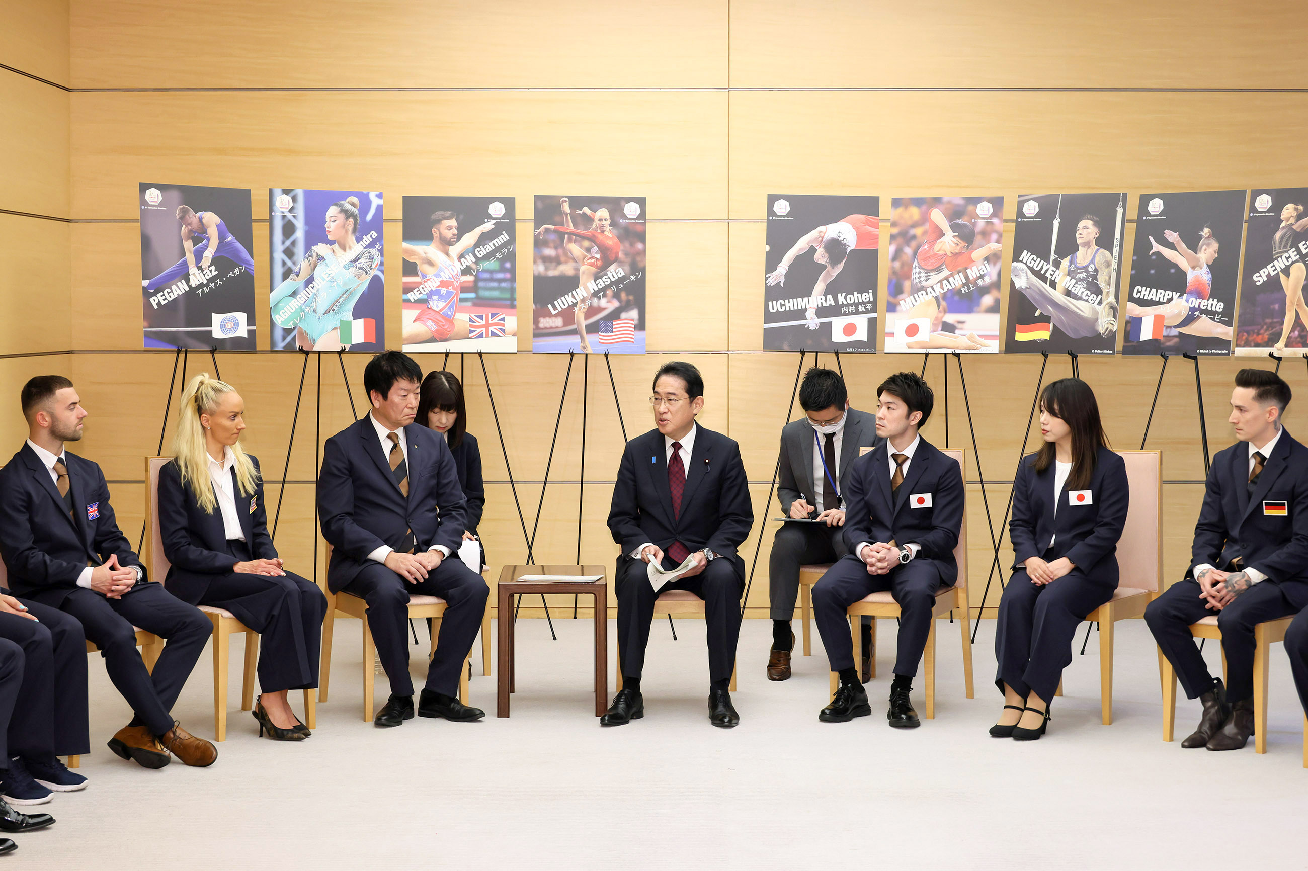 2023年4月27日,岸田首相在官邸接受了国际体操联合会主席渡边守成等人的拜访。