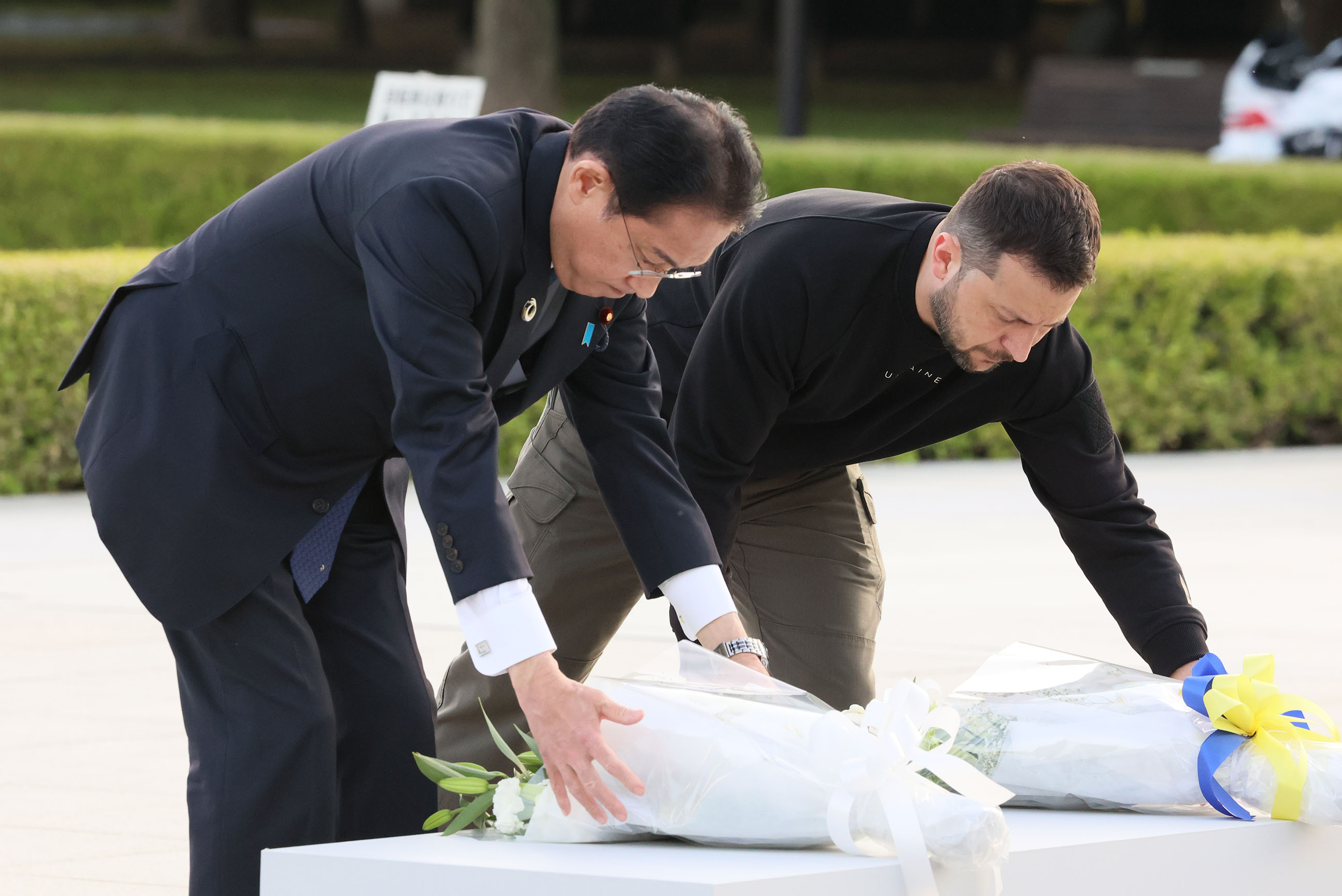 2023年5月21日,正在访问广岛县的岸田首相与乌克兰总统弗拉基米尔・泽连斯基(Volodymyr Zelensky)一同,参观了和平纪念资料馆,并向原子弹爆炸遇难者慰灵碑献花致意。