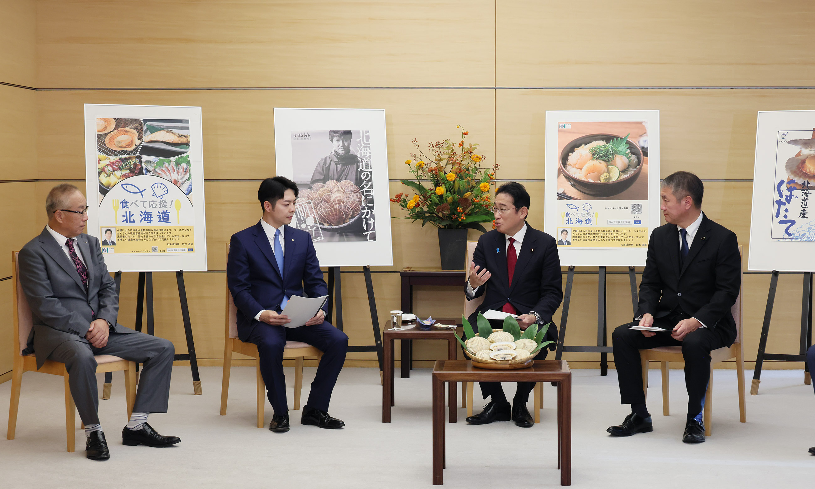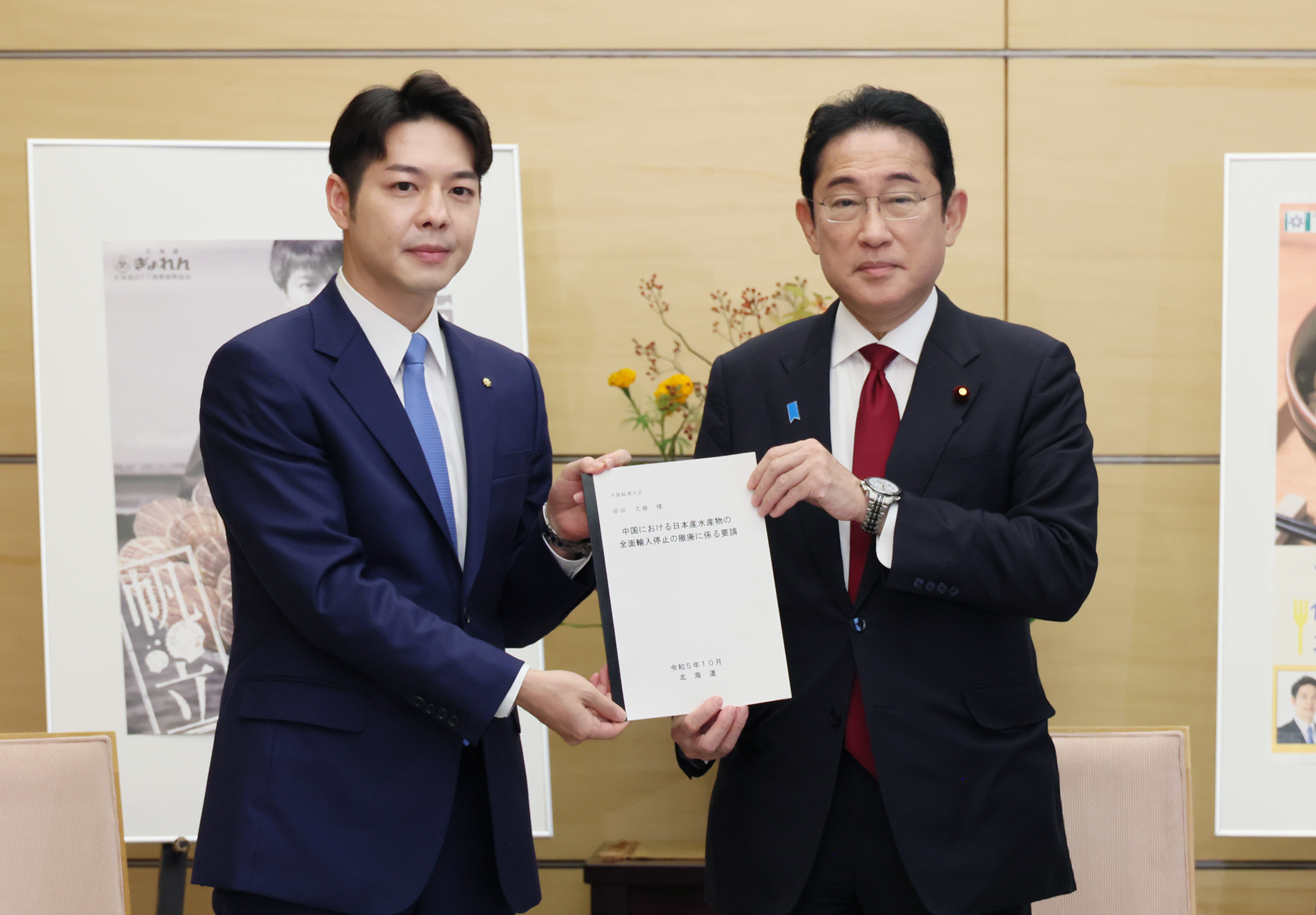 #ALPS处理水 接受北海道厅、北海道议会、北海道渔业协同组合联合会赠送的扇贝和请愿书 2023年 10月 17日 (周二) 发推 (暂译) 2023年10月17日,岸田首相在首相官邸接受了北海道知事铃木直道、北海道议会(道议会)和北海道渔业协会联合会(道渔联)赠送的扇贝,并接受了请愿书。 更多