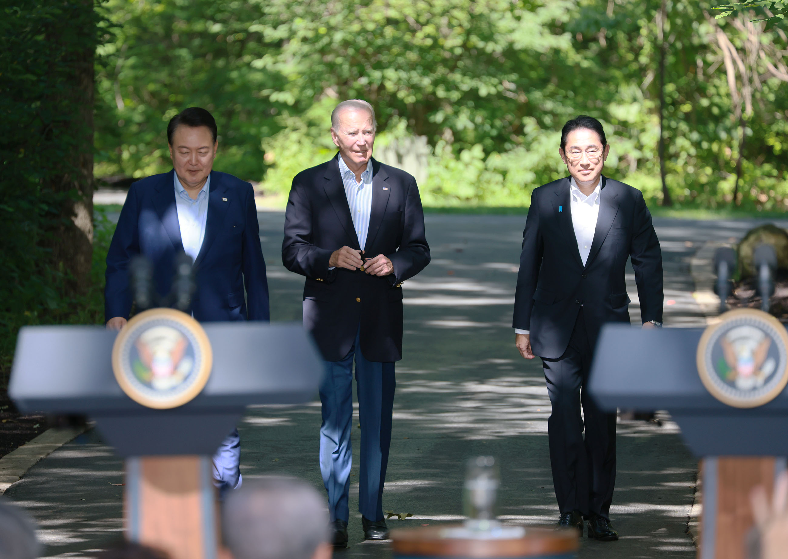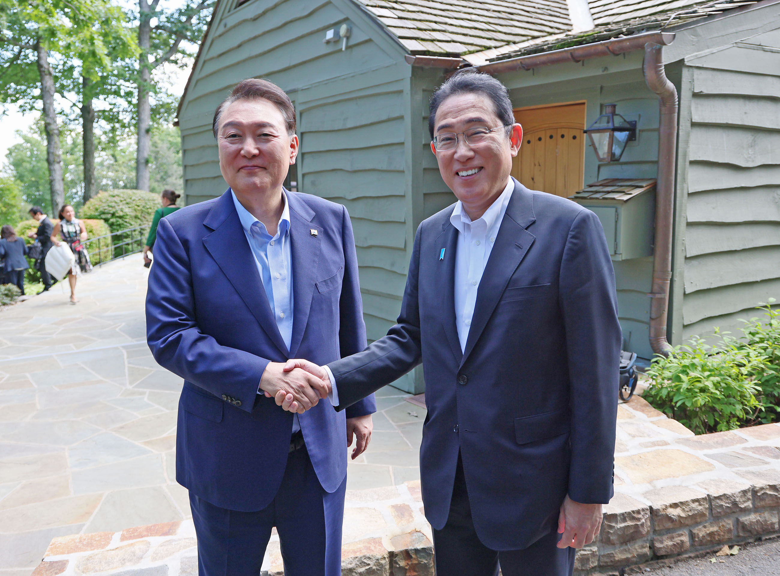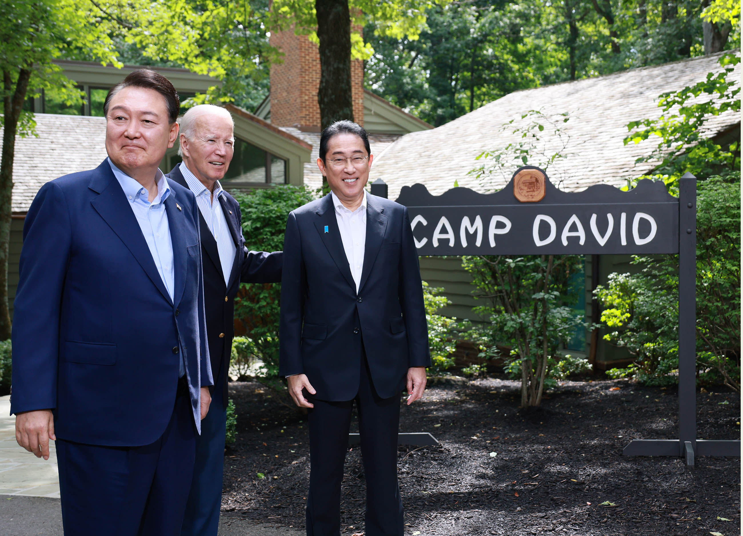 次日,在马里兰州戴维营,岸田首相与美利坚合众国总统约瑟夫・拜登(Joseph R.Biden),以及拜登和大韩民国总统尹锡悦(Yun Seok-yeol)分别举行了日美首脑会谈和日美韩首脑会谈。之后,又与韩国尹总统单独会谈。最后,召开日美韩联合记者招待会,就访问美国等事宜接受了各家媒体采访。