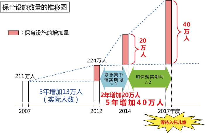 - 就“加快落实期间”(2015~2017年度),包括上述内容在内,确保增设可接收约40万名儿童的保育设施。