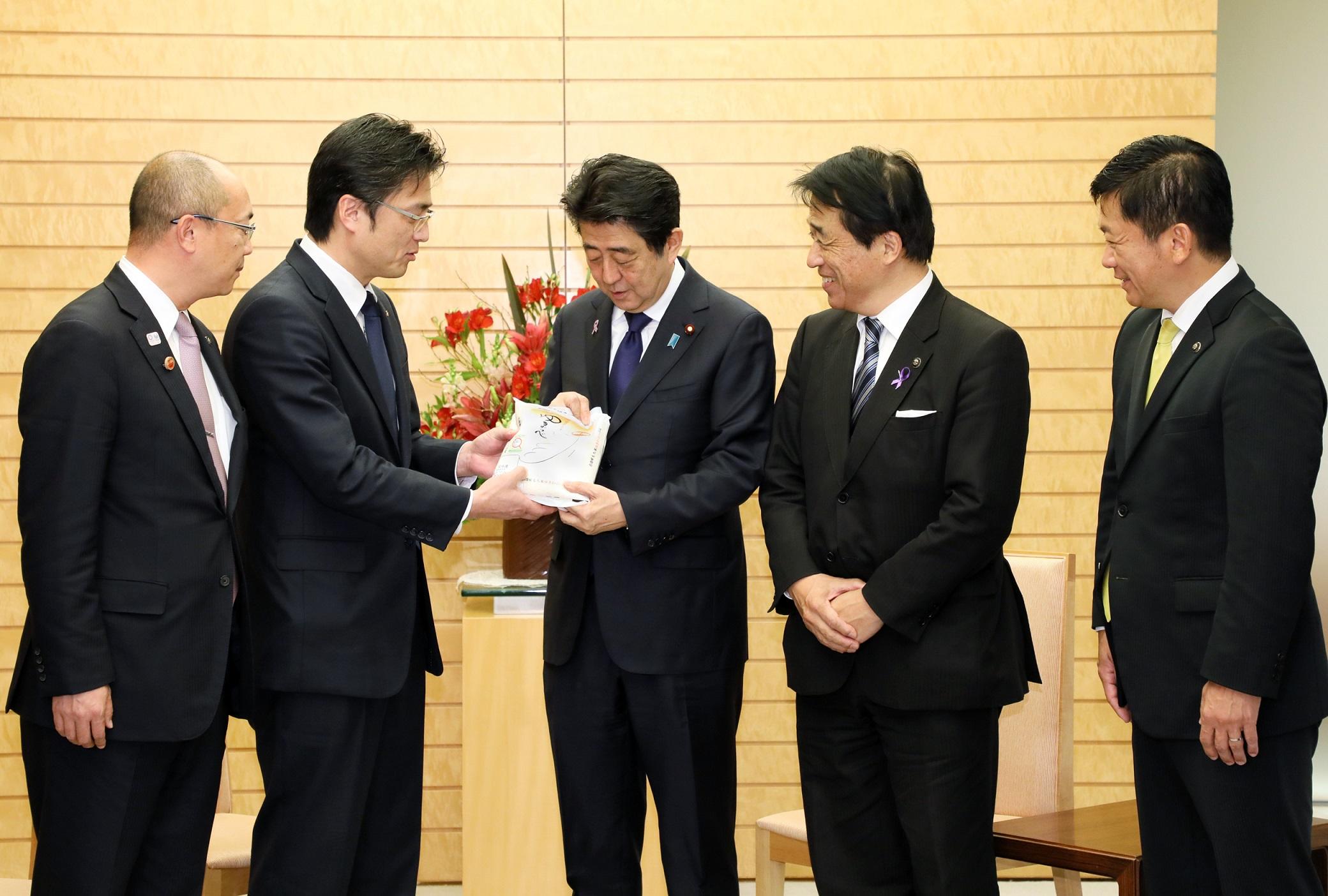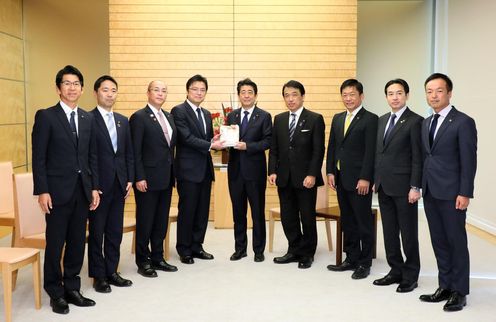 安倍总理在总理大臣官邸接受了全国青年市长会的拜访。