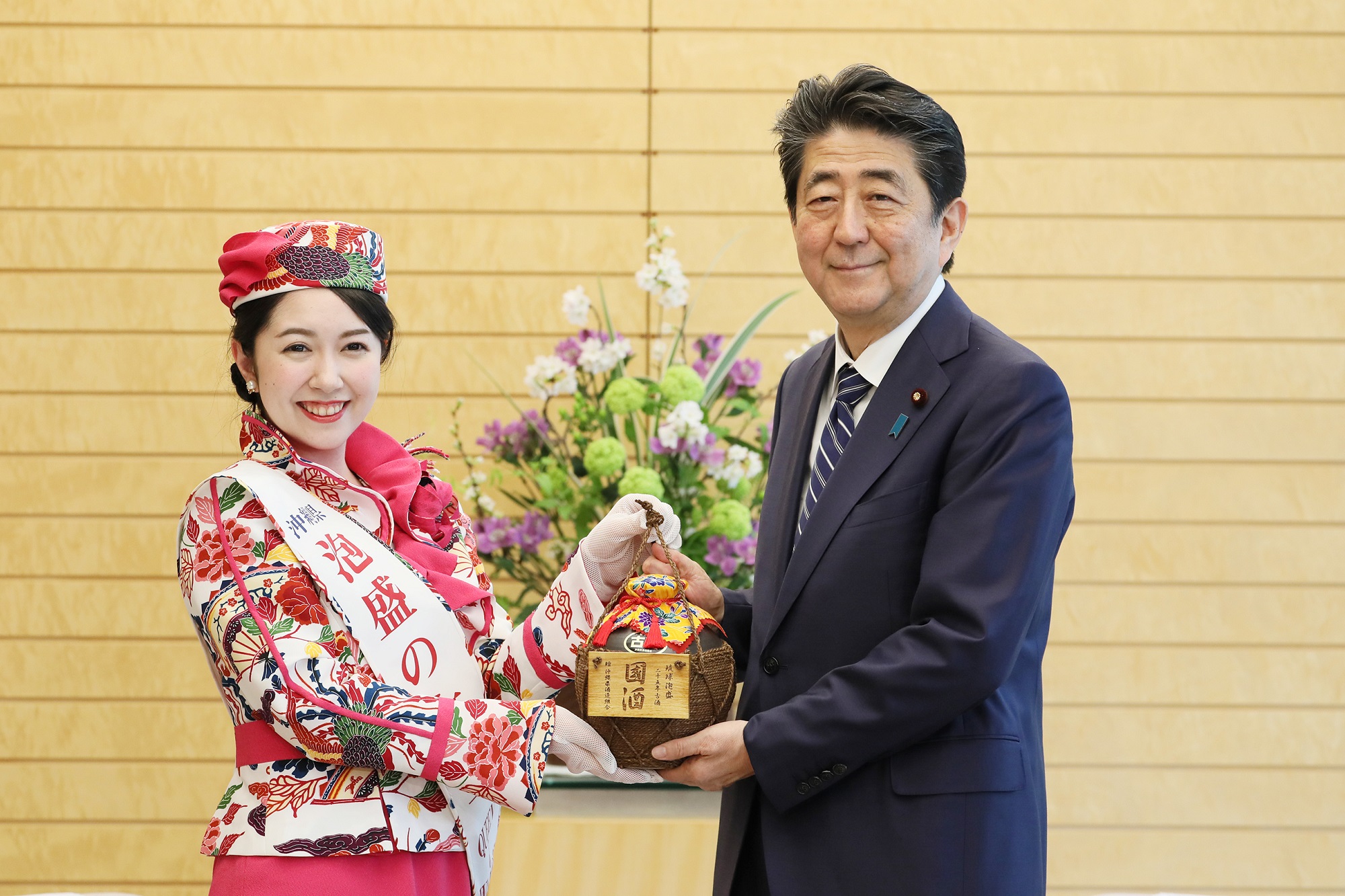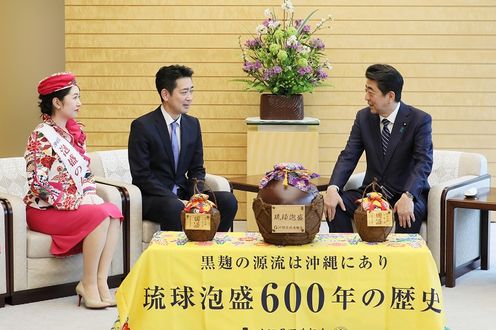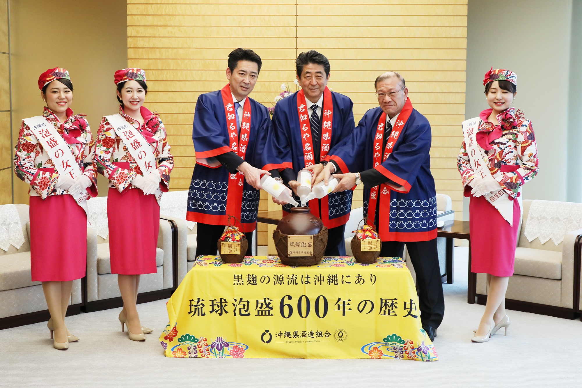 安倍总理在总理大臣官邸接受了赠送的琉球泡盛。