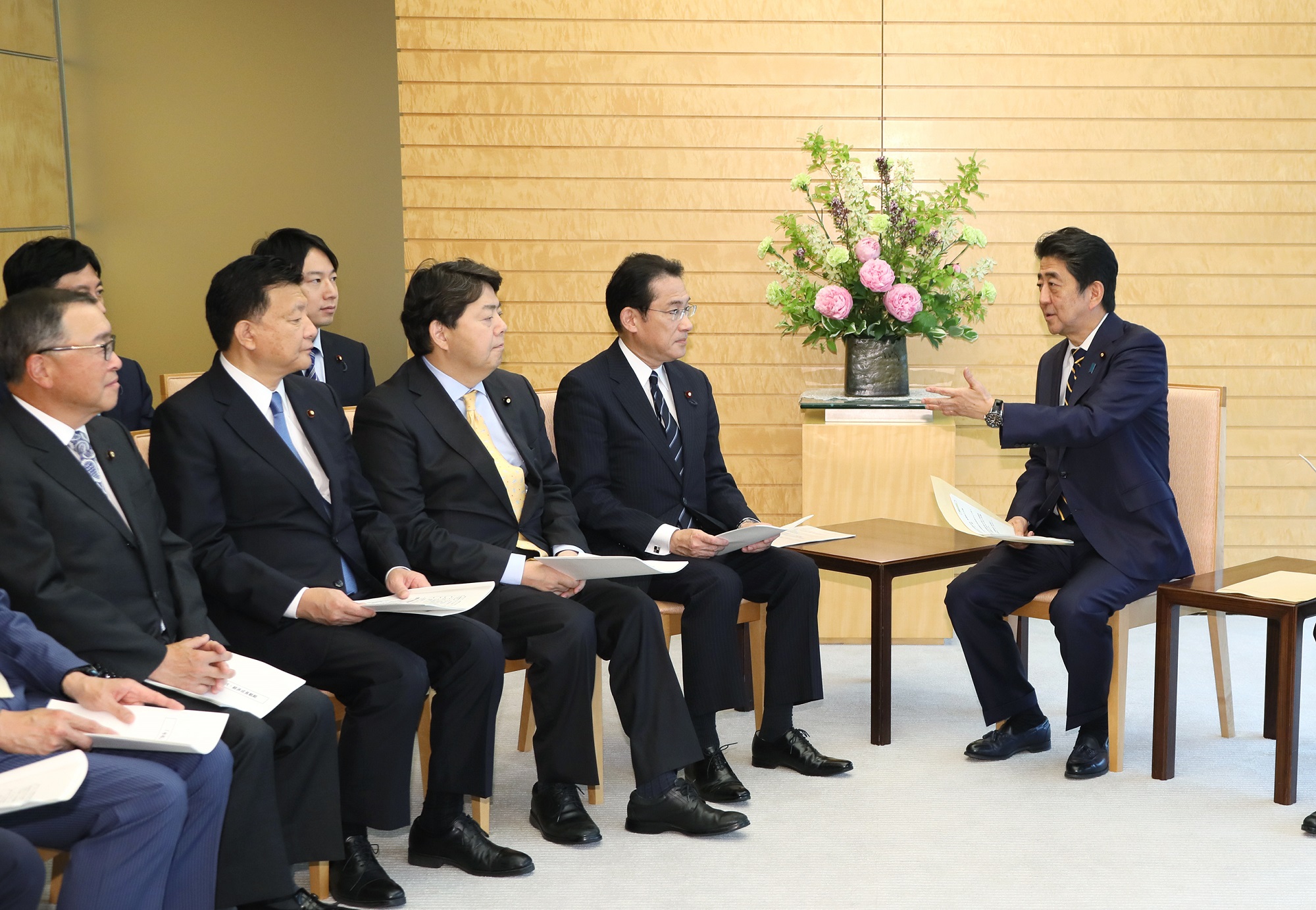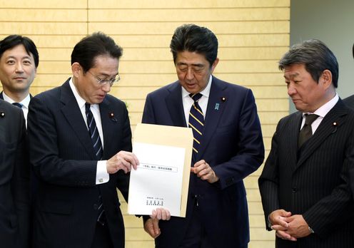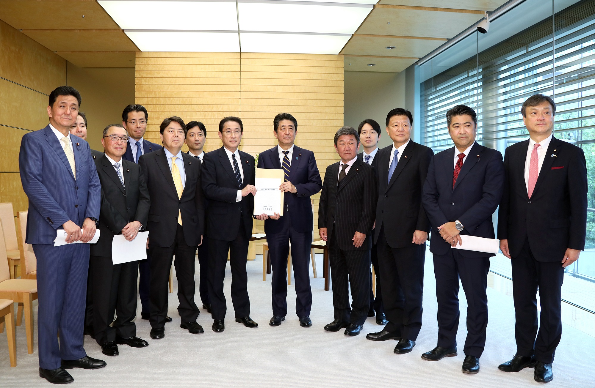 安倍总理在总理大臣官邸接收了自由民主党经济成长战略本部的建议。
