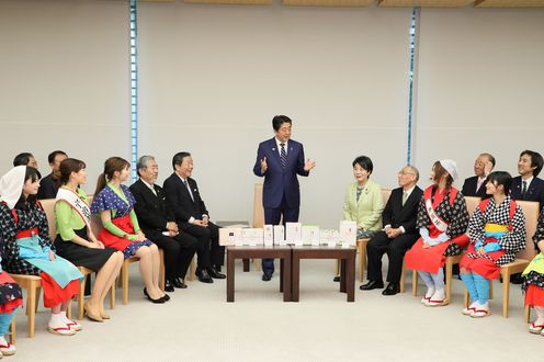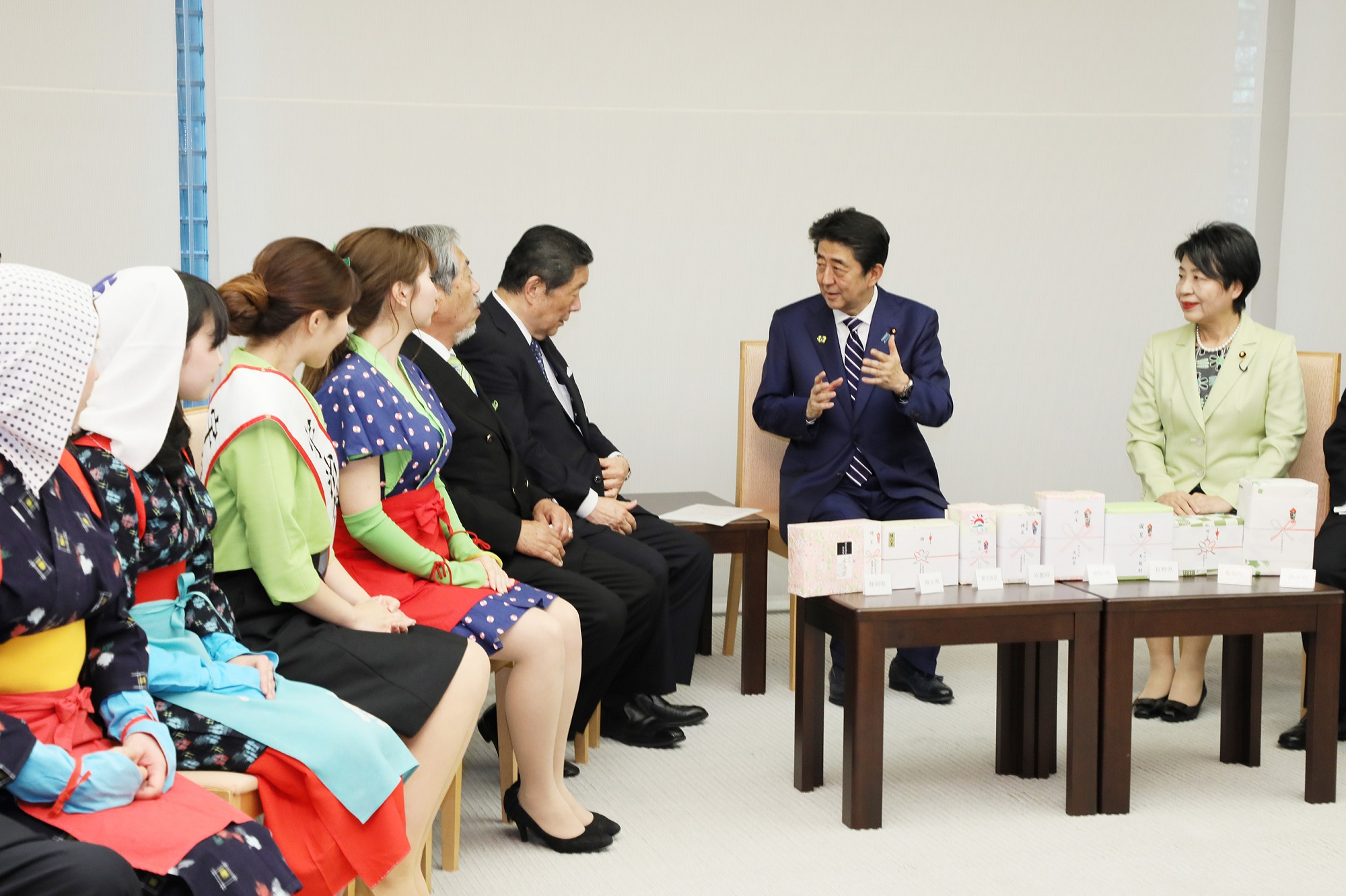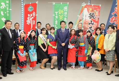 安倍总理在总理大臣官邸出席了自由民主党茶业振兴议员联盟等的新茶赠送仪式。