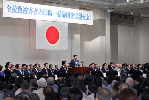 安倍总理在东京都内与被北朝鲜绑架受害者家属见面,出席了“实现所有被北朝鲜绑架受害者立即一同回国!国民大集会”。