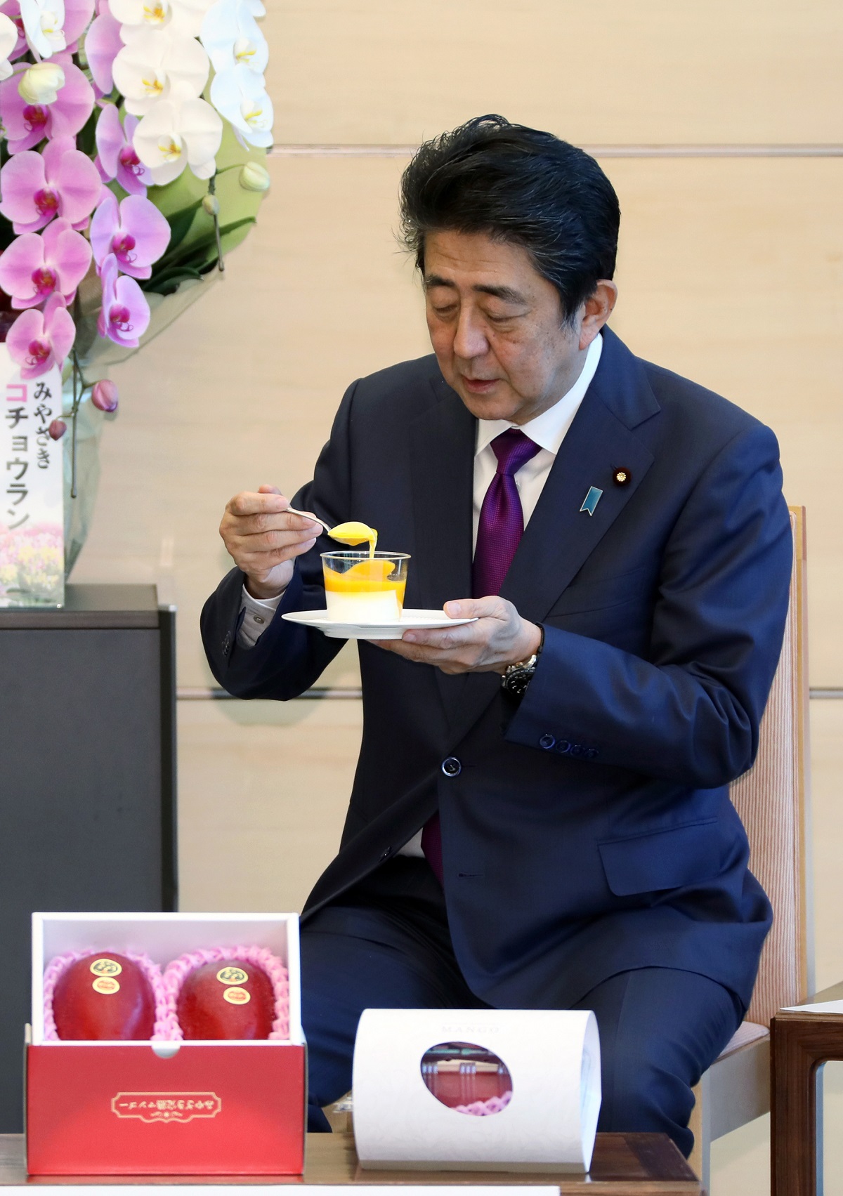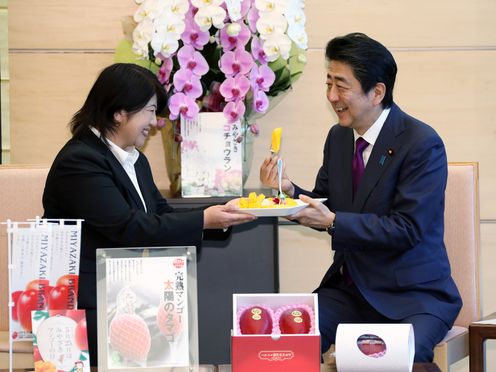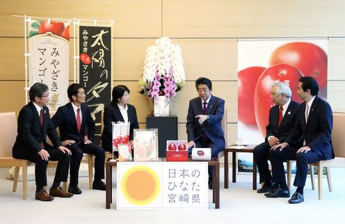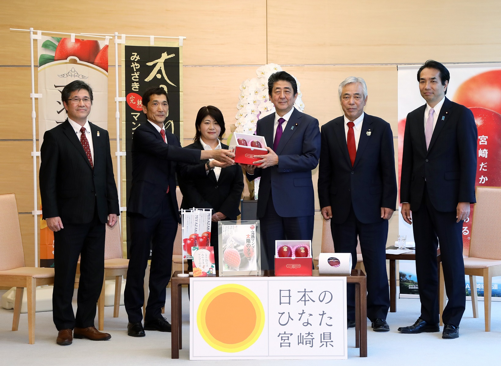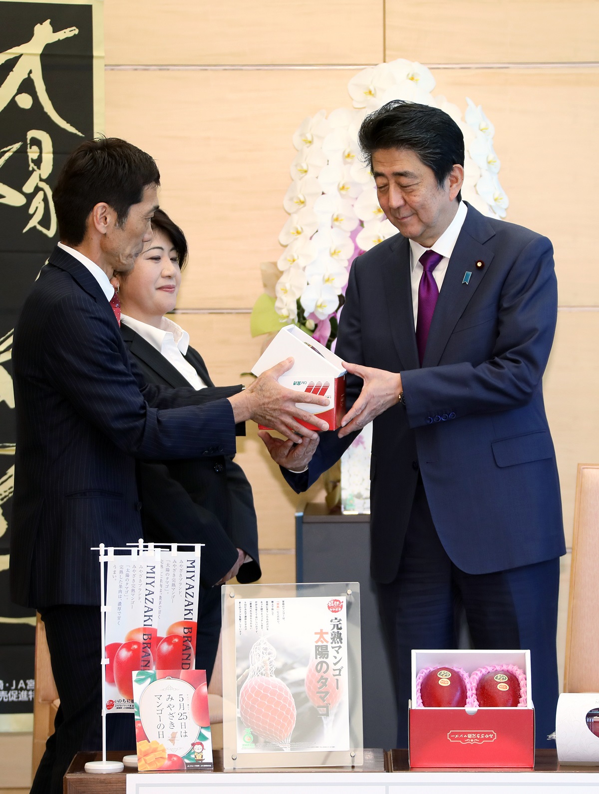 安倍总理在总理大臣官邸接受了宫崎全熟芒果“太阳之蛋”生产者等的拜访。