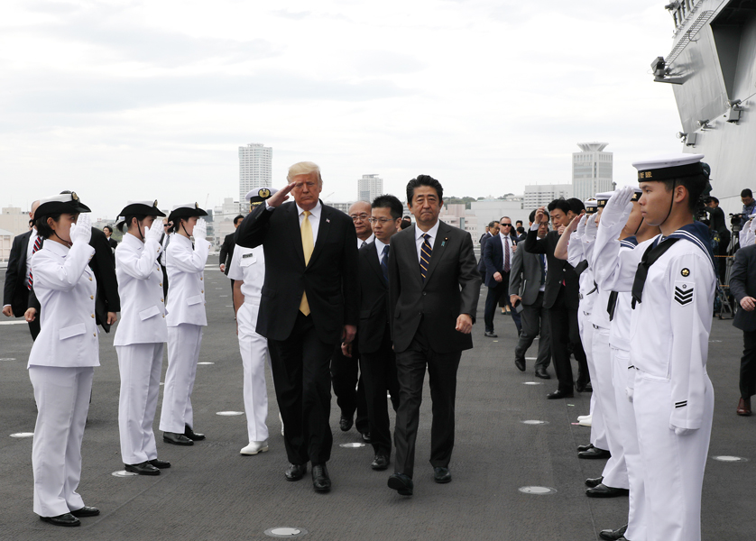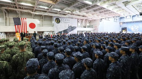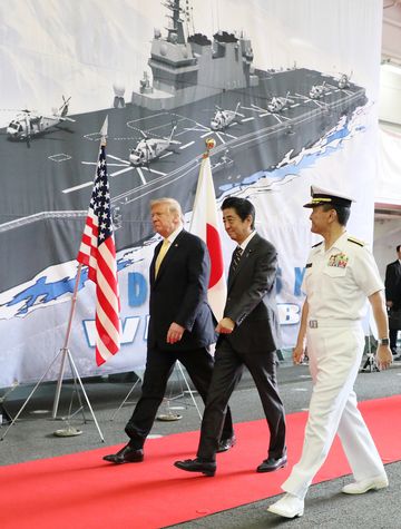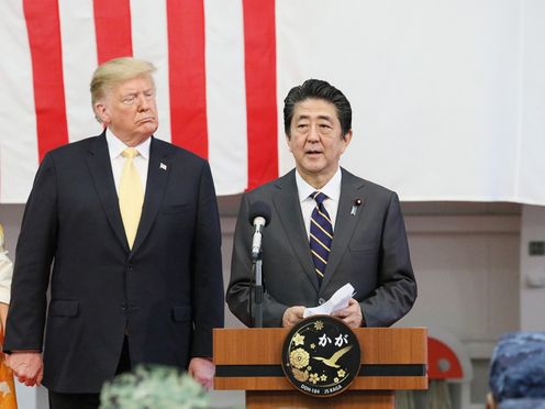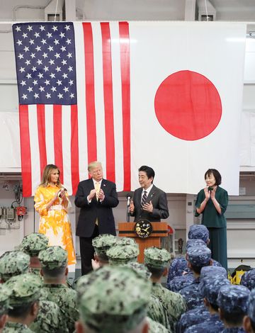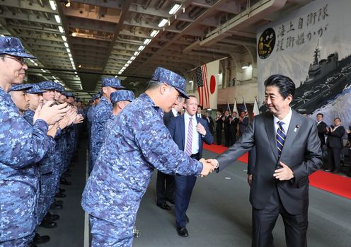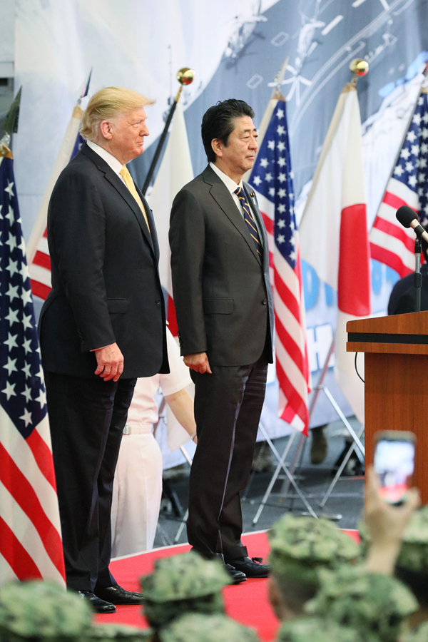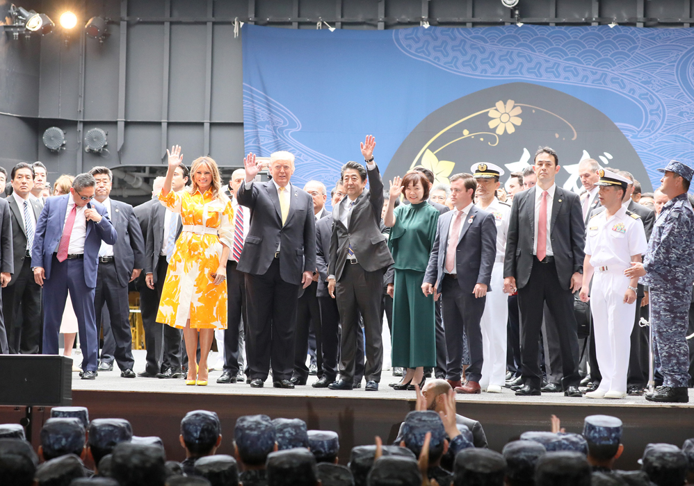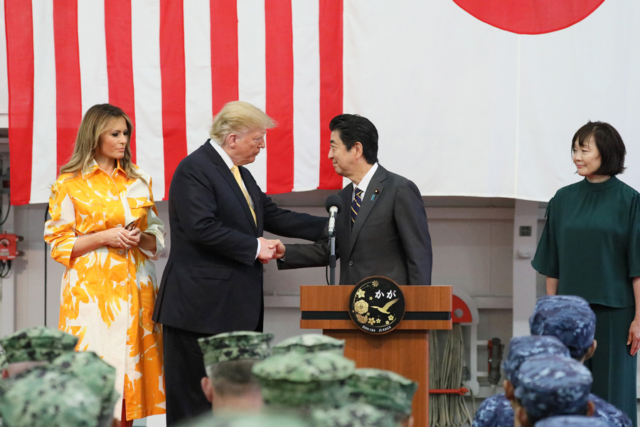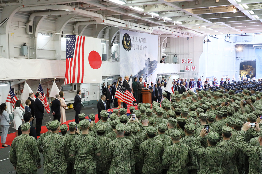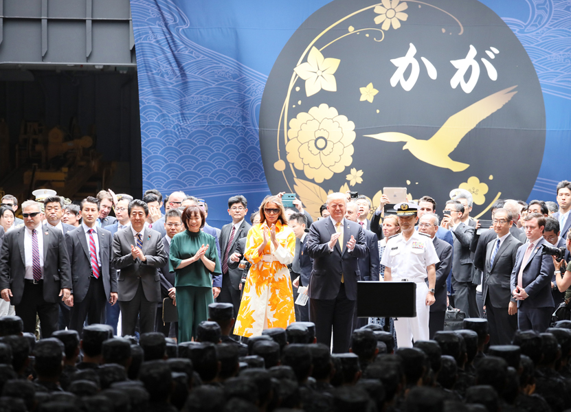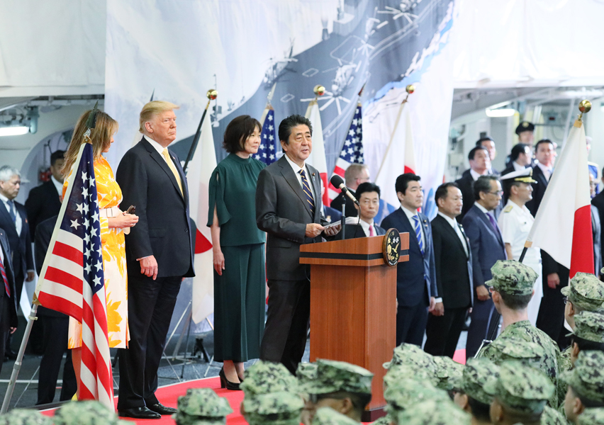 2019年5月28日,安倍总理在神奈川县横须贺市与美利坚合众国总统唐纳德・特朗普夫妇访问了“加贺”号护卫舰。总理在激励自卫队及驻日美军的队员时表示: