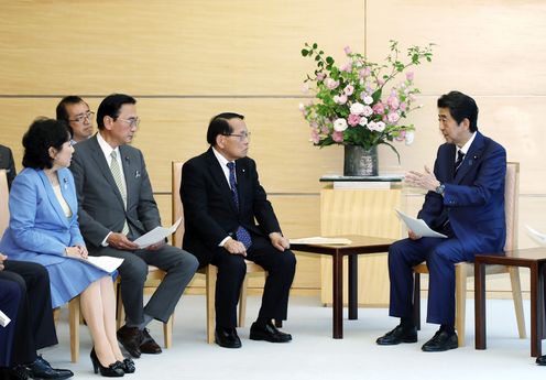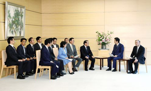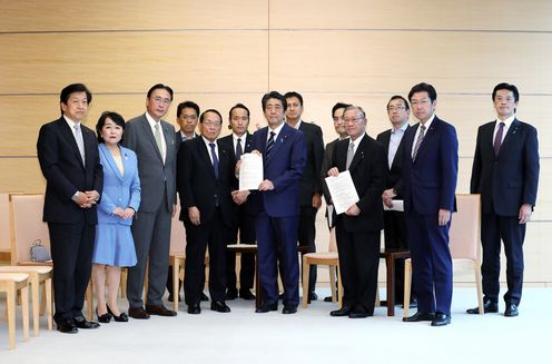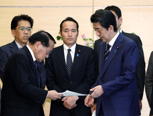 安倍总理在总理大臣官邸接收了自由民主党交通安全对策特别委员会等的建议。