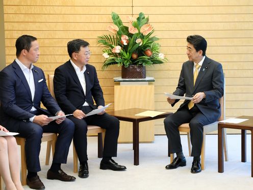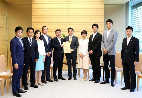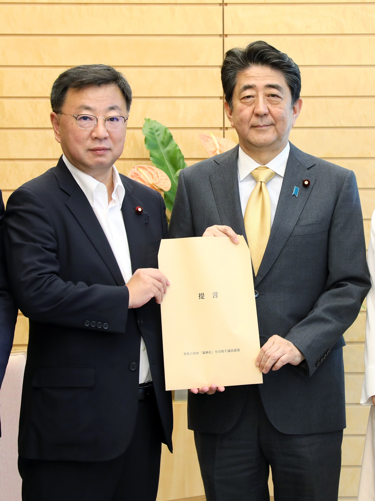 安倍总理在总理大臣官邸接收了自由民主党旨在男性育儿休假“义务化”议员联盟的建议。