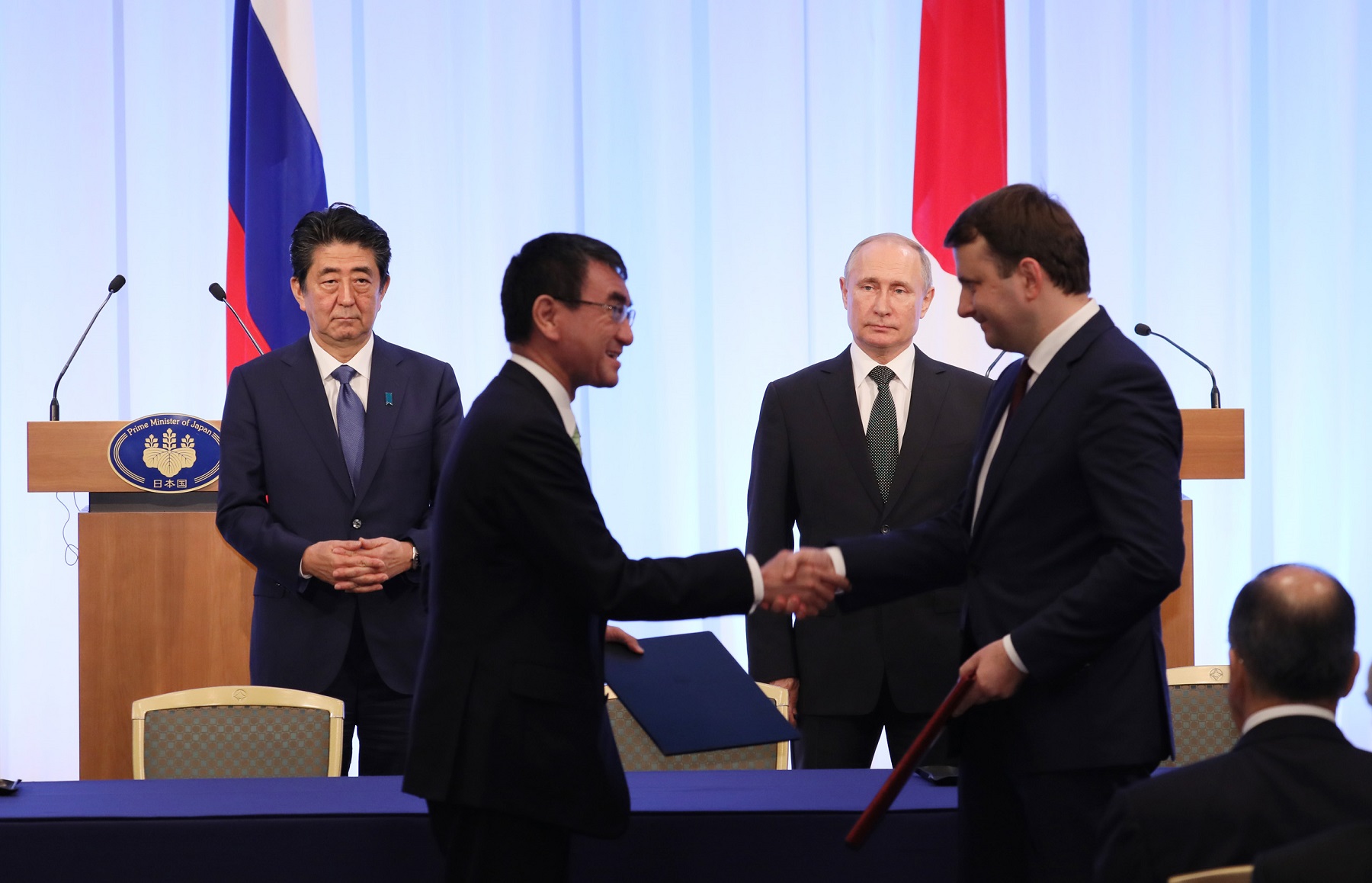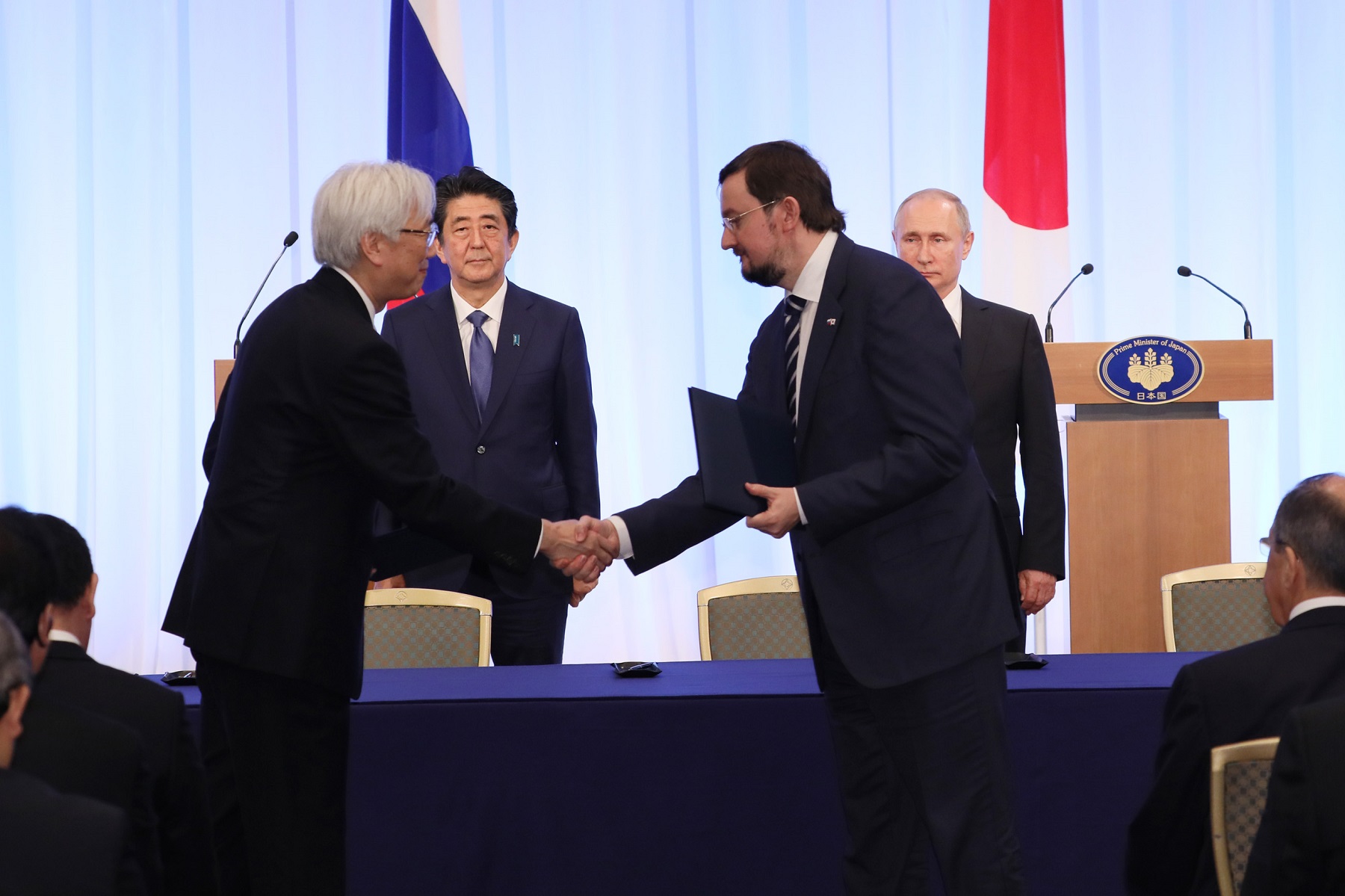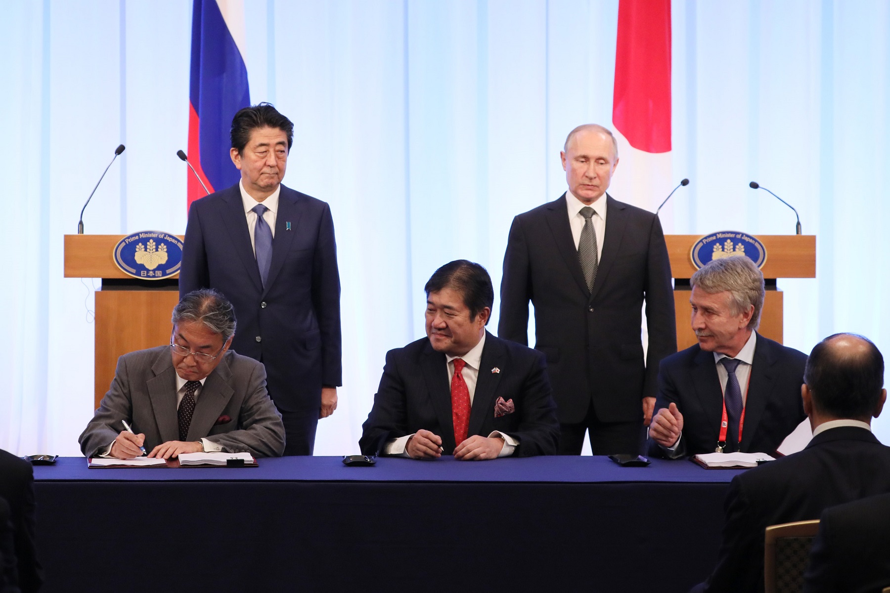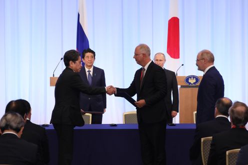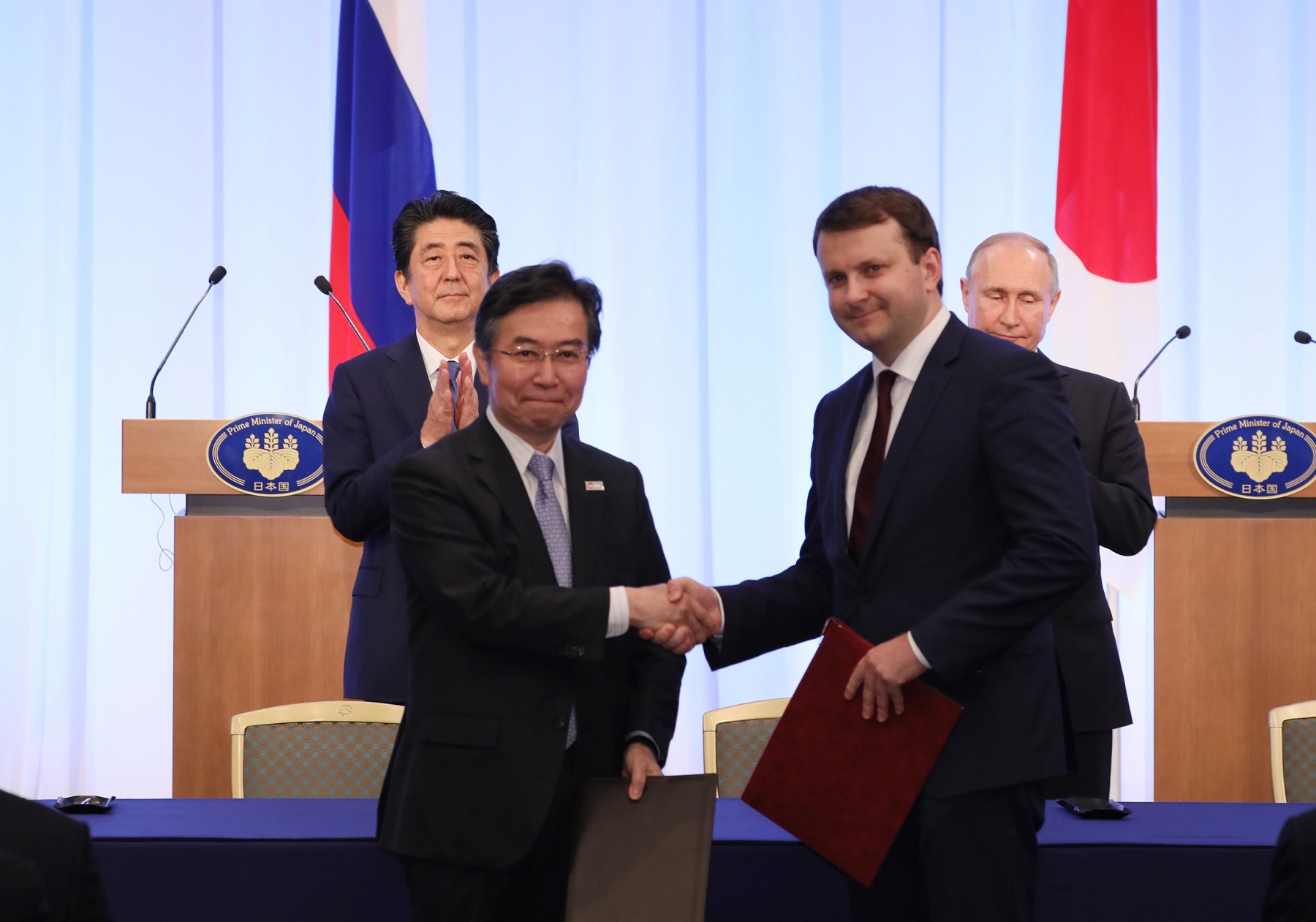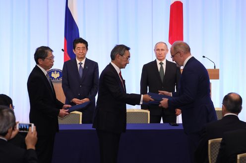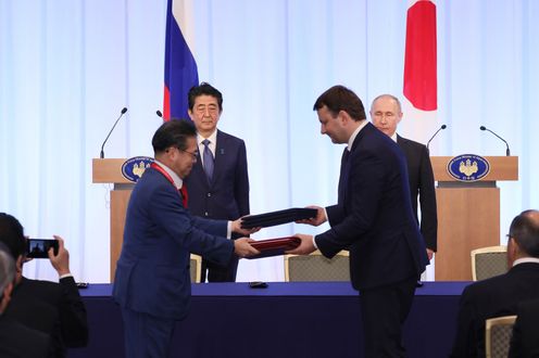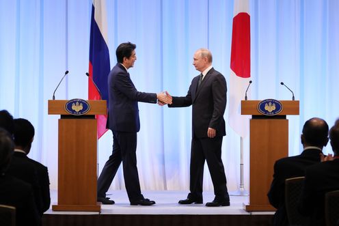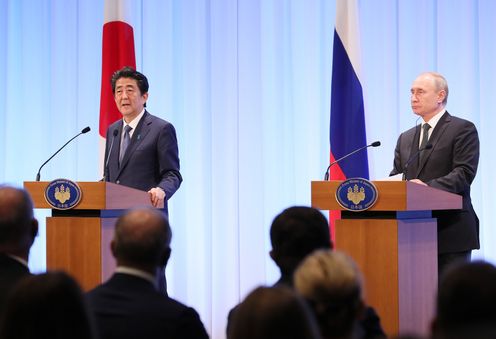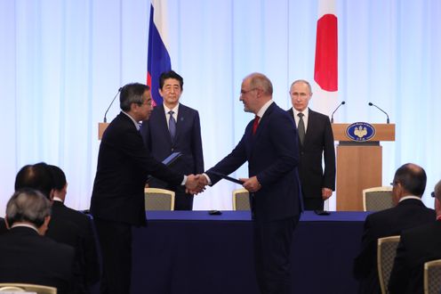 晚上,总理与俄罗斯总统弗拉基米尔・弗拉基米罗维奇・普京一起出席了日俄交流年闭幕仪式,接着举行了会谈,之后,在见证了文件签字仪式及文件交换仪式后,举行了联合记者招待会。