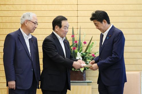 安倍总理在总理大臣官邸接受了执政党东日本大地震复兴加速化本部递交的第8次提议书。
