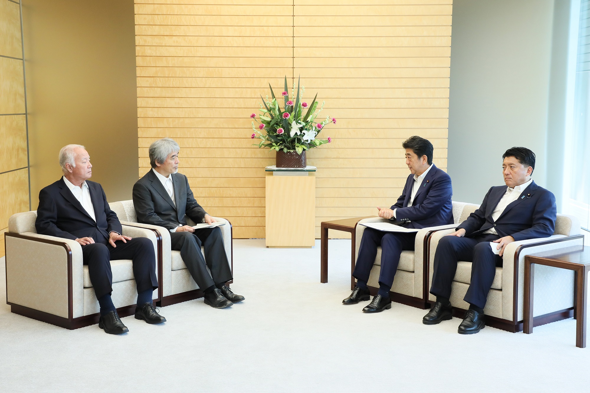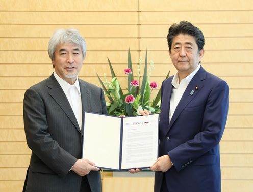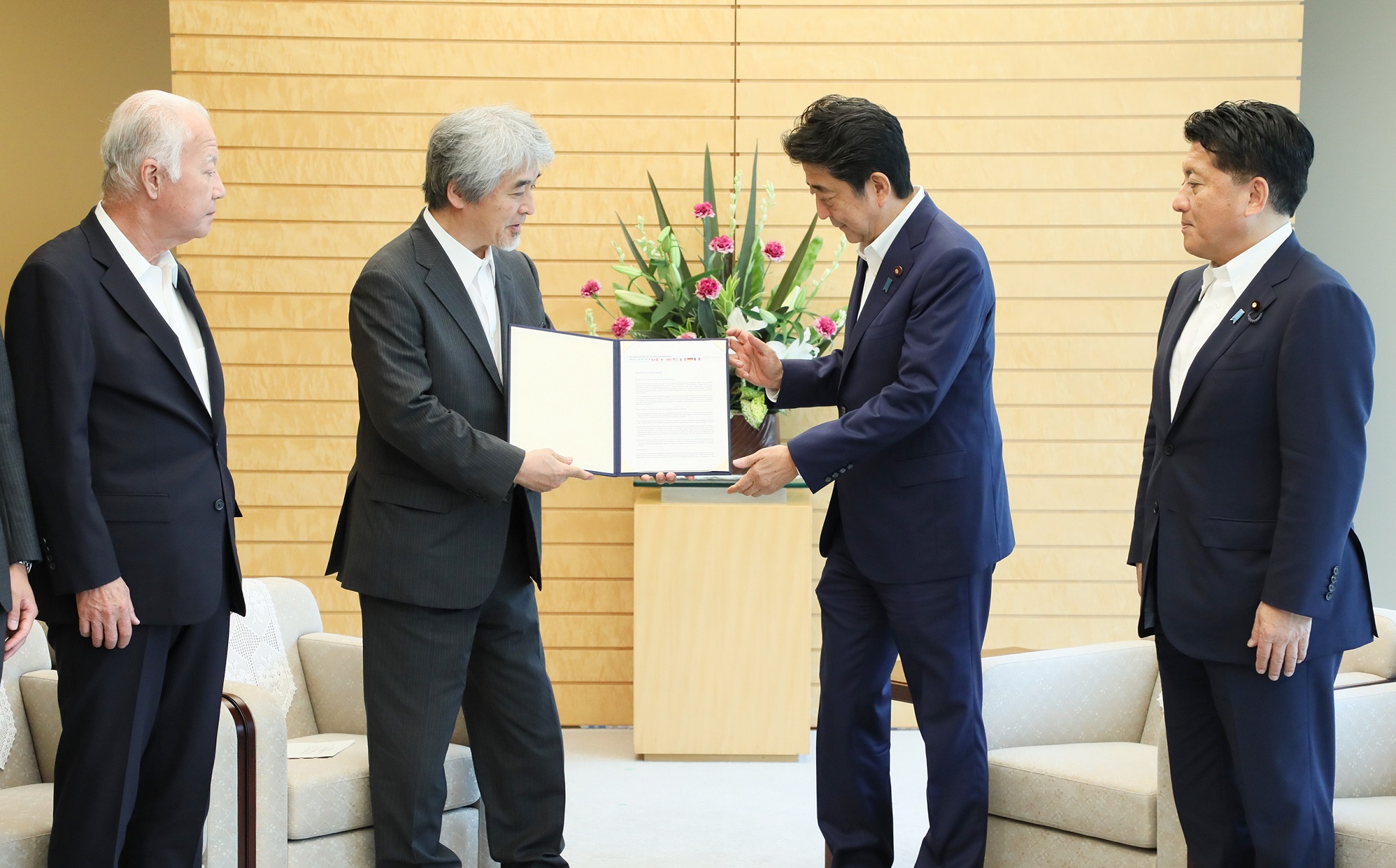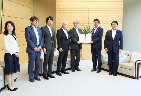 安倍总理在总理大臣官邸接收了日本学术会议递交的G科学学术会议联合声明。