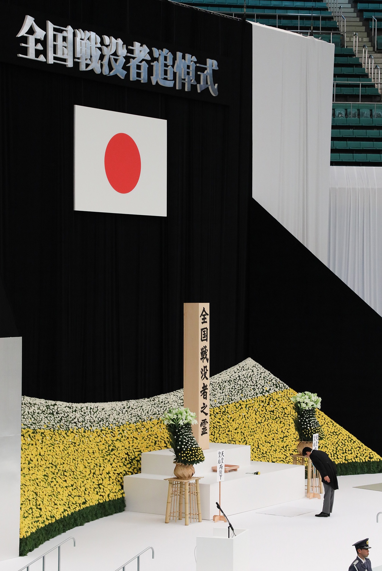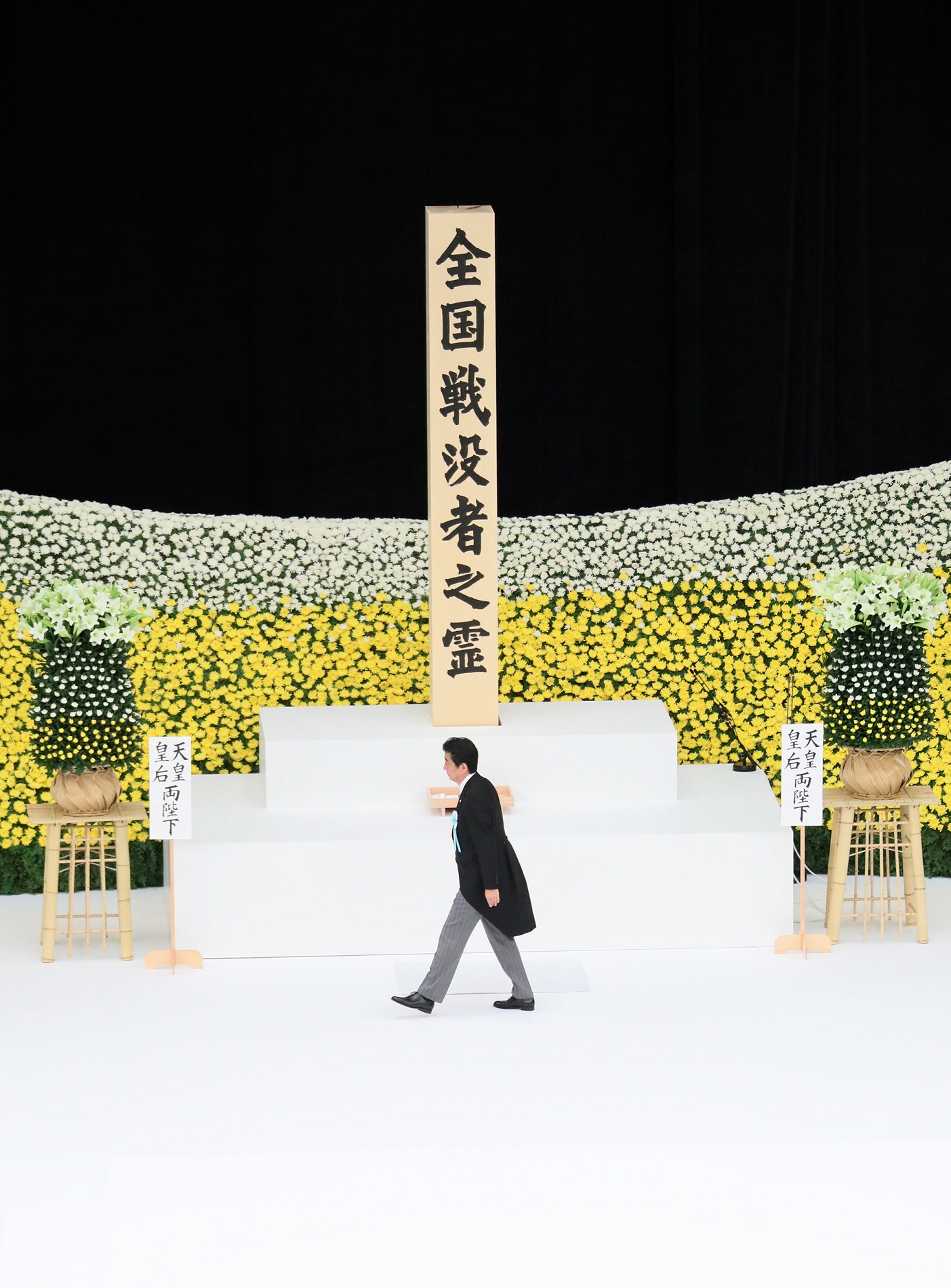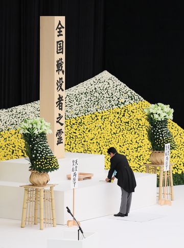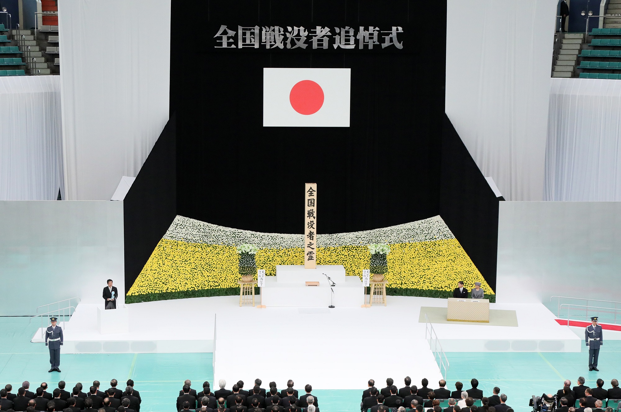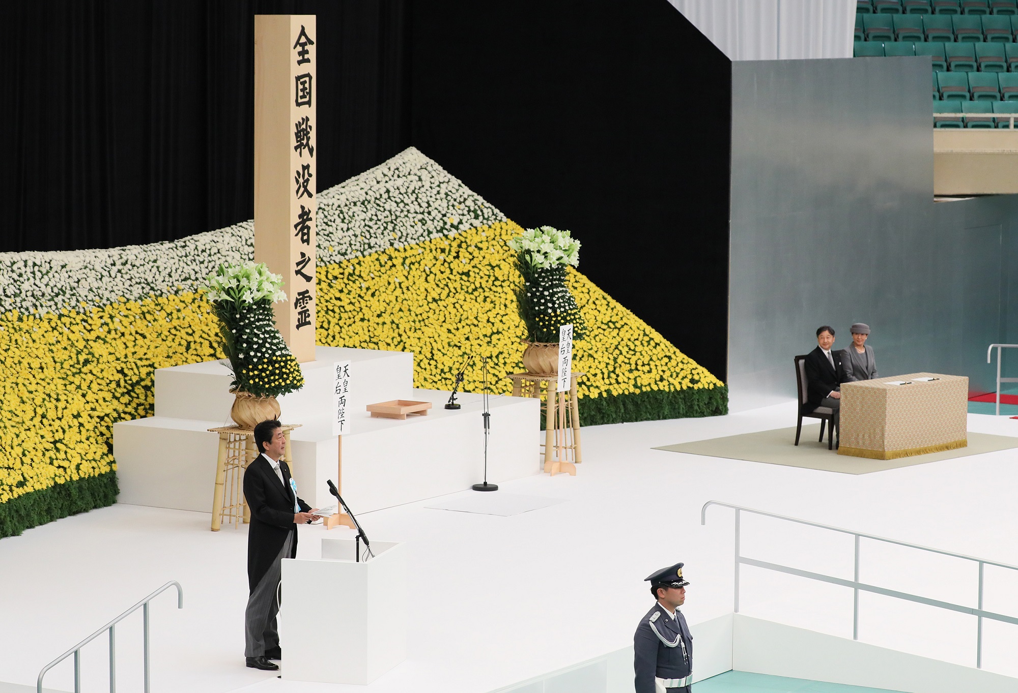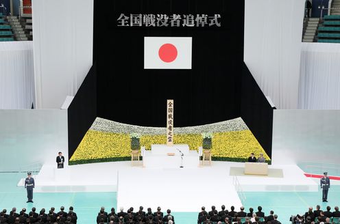 在天皇和皇后两位陛下的莅临之下,安倍总理出席了在日本武道馆举行的全国战争死难者追悼仪式。