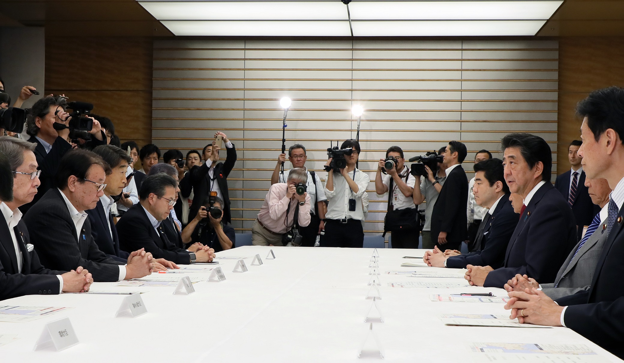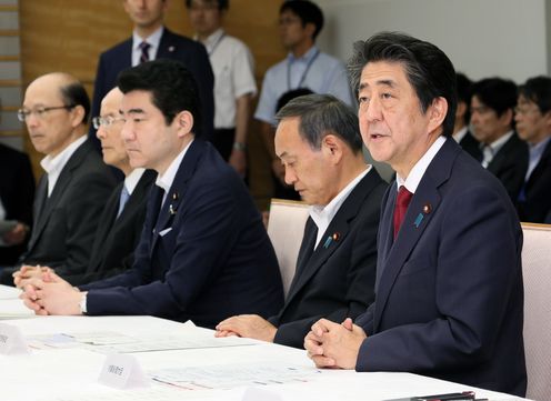 安倍总理在总理大臣官邸召开了有关2019年8月锋面的大雨的相关阁僚会议。
