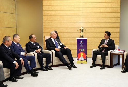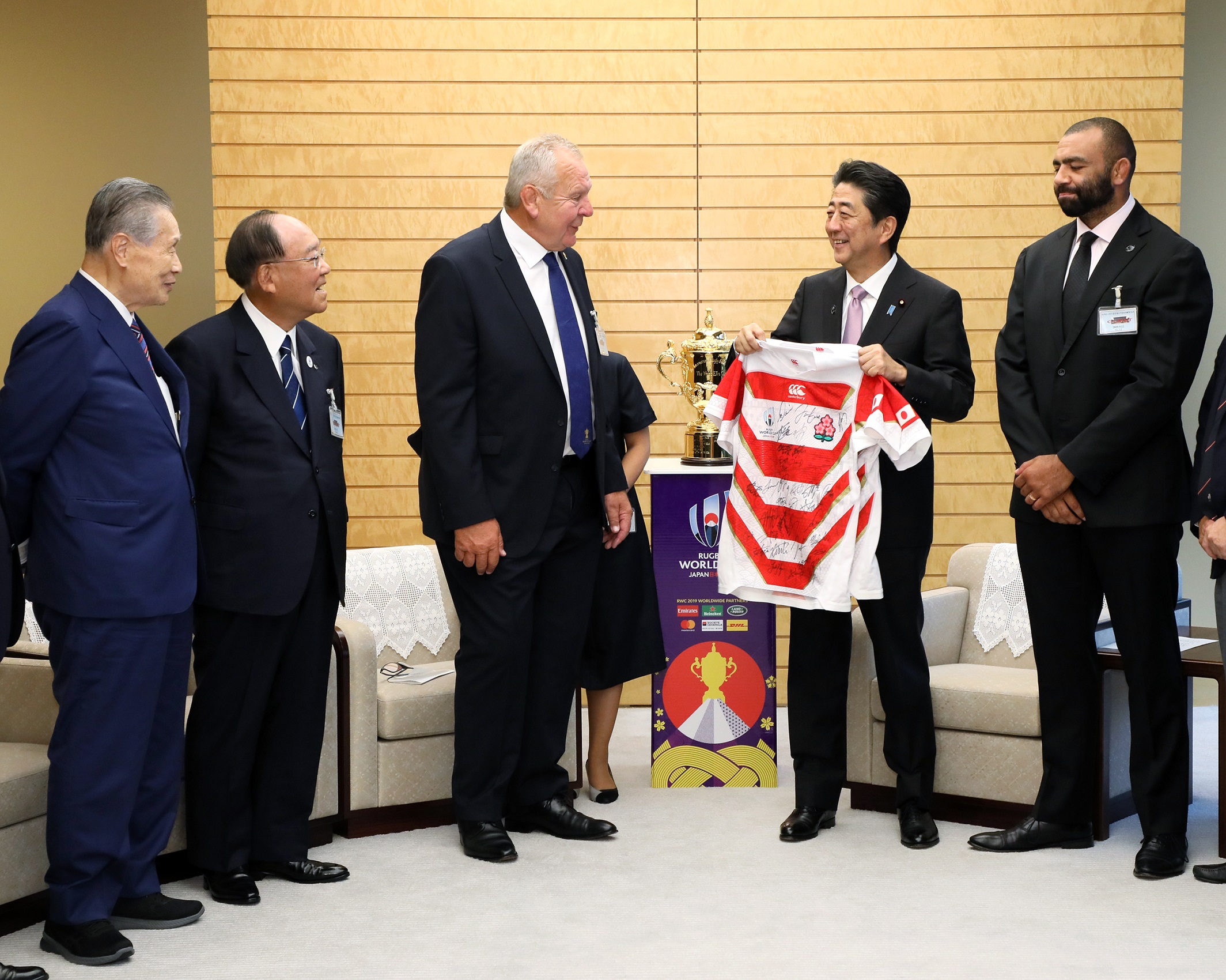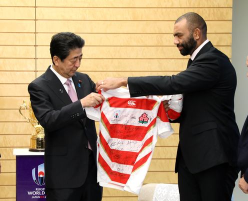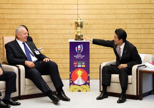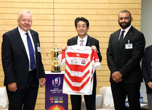 2019年9月12日,安倍总理在总理大臣官邸接受了世界橄榄球协会主席比尔・比约蒙特等橄榄球世界杯赛2019年日本奖杯巡展的相关人员的拜会。