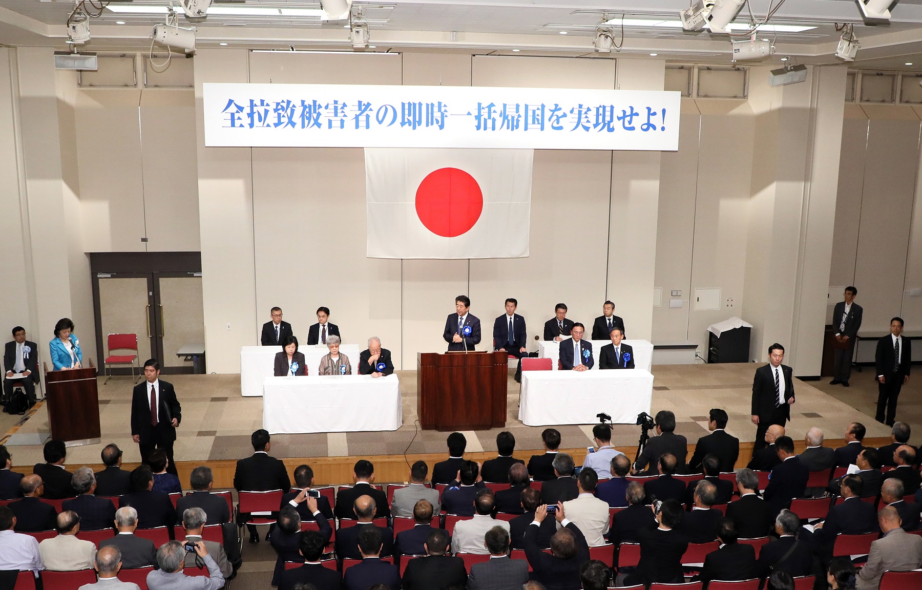 安倍总理在东京都内与被北朝鲜绑架受害者家属见面,出席了“实现所有被北朝鲜绑架受害者立即一同回国!国民大集会”。