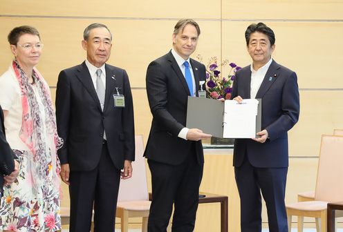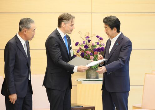 安倍总理在总理大臣官邸接受了日本・欧盟商业圆桌会议(BRT)的日方联合议长柵山正树、欧盟方代理联合议长迈克尔・慕罗茨克(Michael・Mroczek)等的拜会。