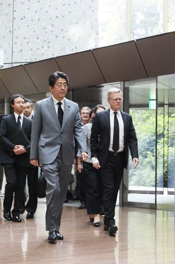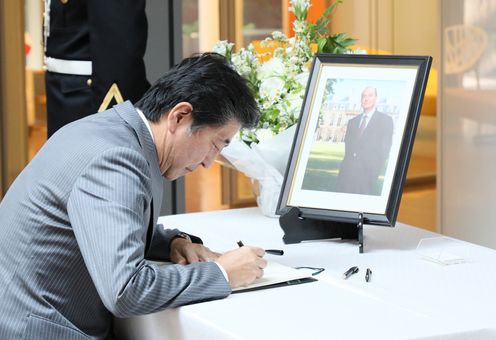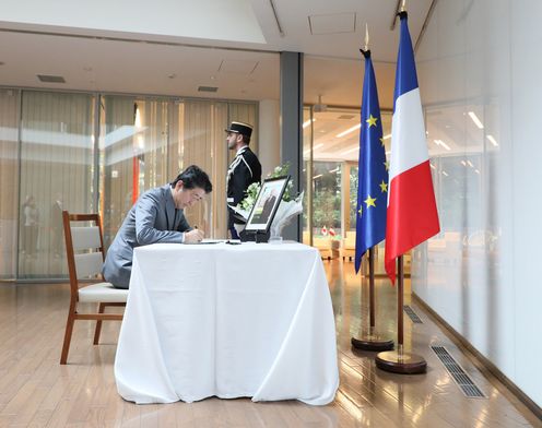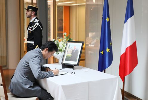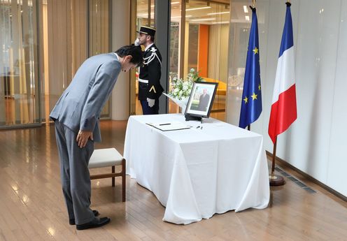 安倍总理因法兰西共和国前总统雅克・希拉克逝世,前往法国大使馆吊唁,并在吊唁簿上题词。