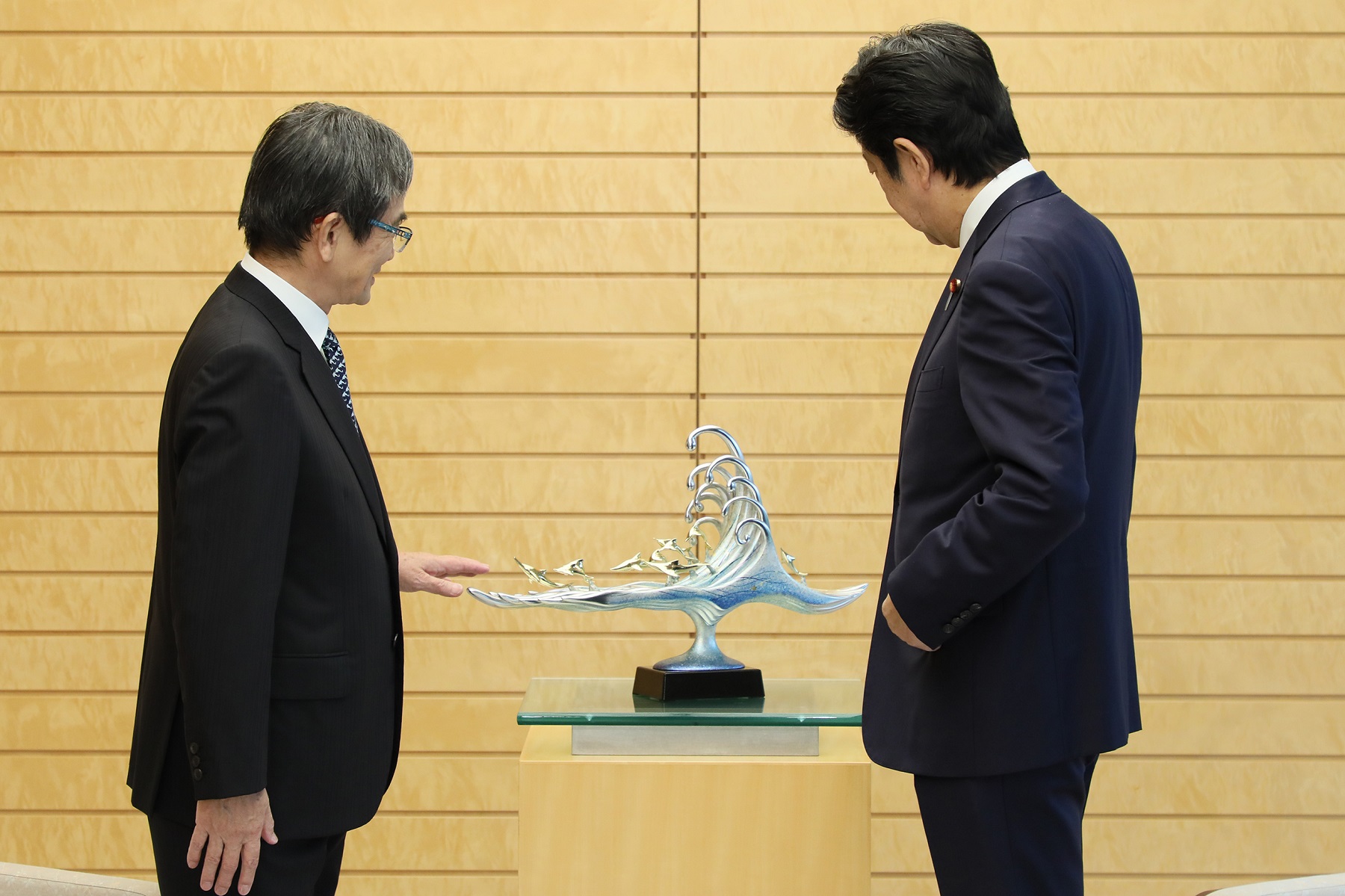 安倍总理在总理大臣官邸接收了文化厅长官宫田亮平递交的全体内阁祝贺天皇陛下即位的贺礼。