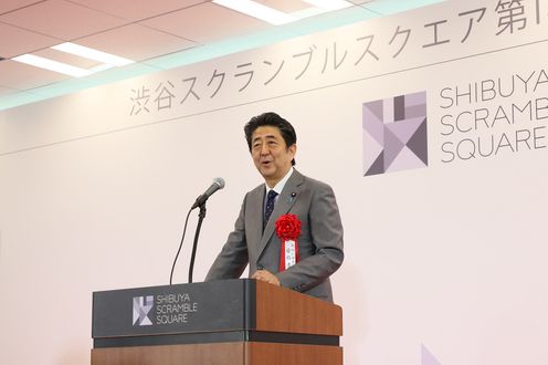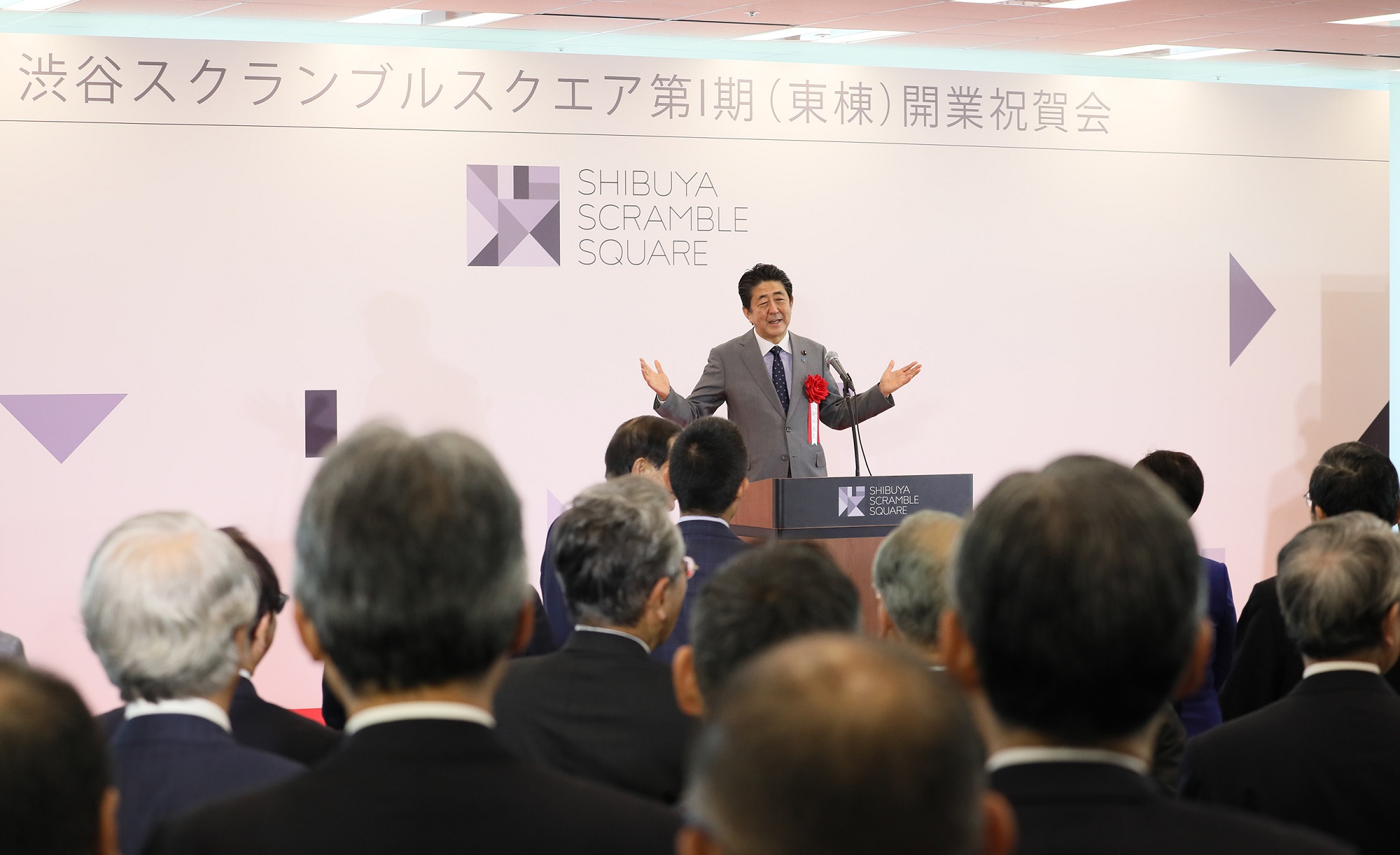 安倍总理出席了在东京都内举行的涩谷Scramble Square摩天大楼第Ⅰ期(东楼)开业祝贺会。