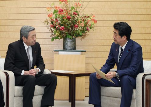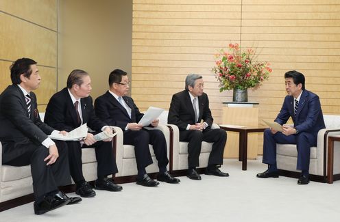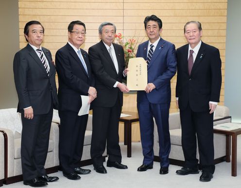 安倍总理在总理大臣官邸接收了自由民主党国土强韧化推进本部递交的决议。
