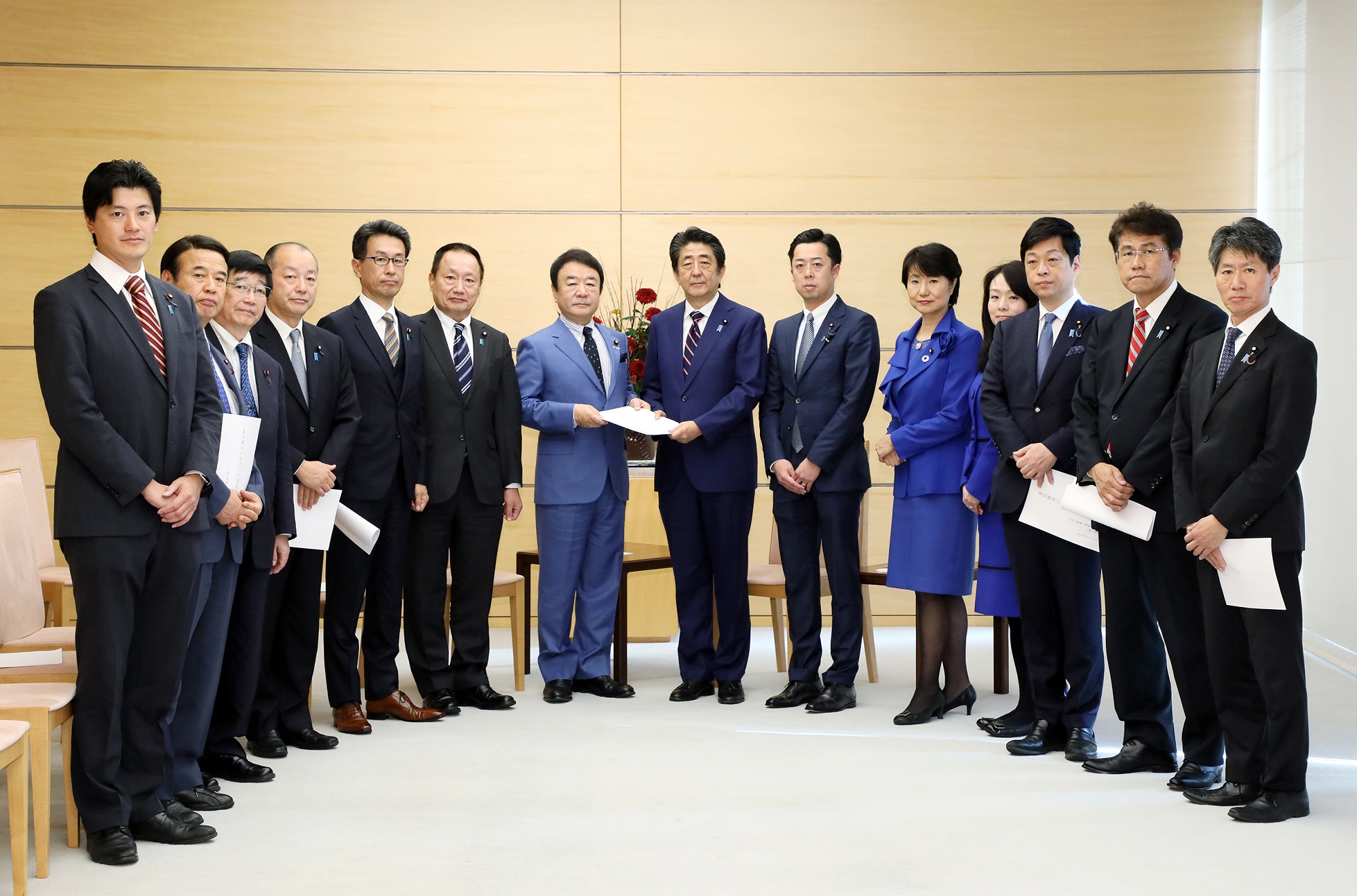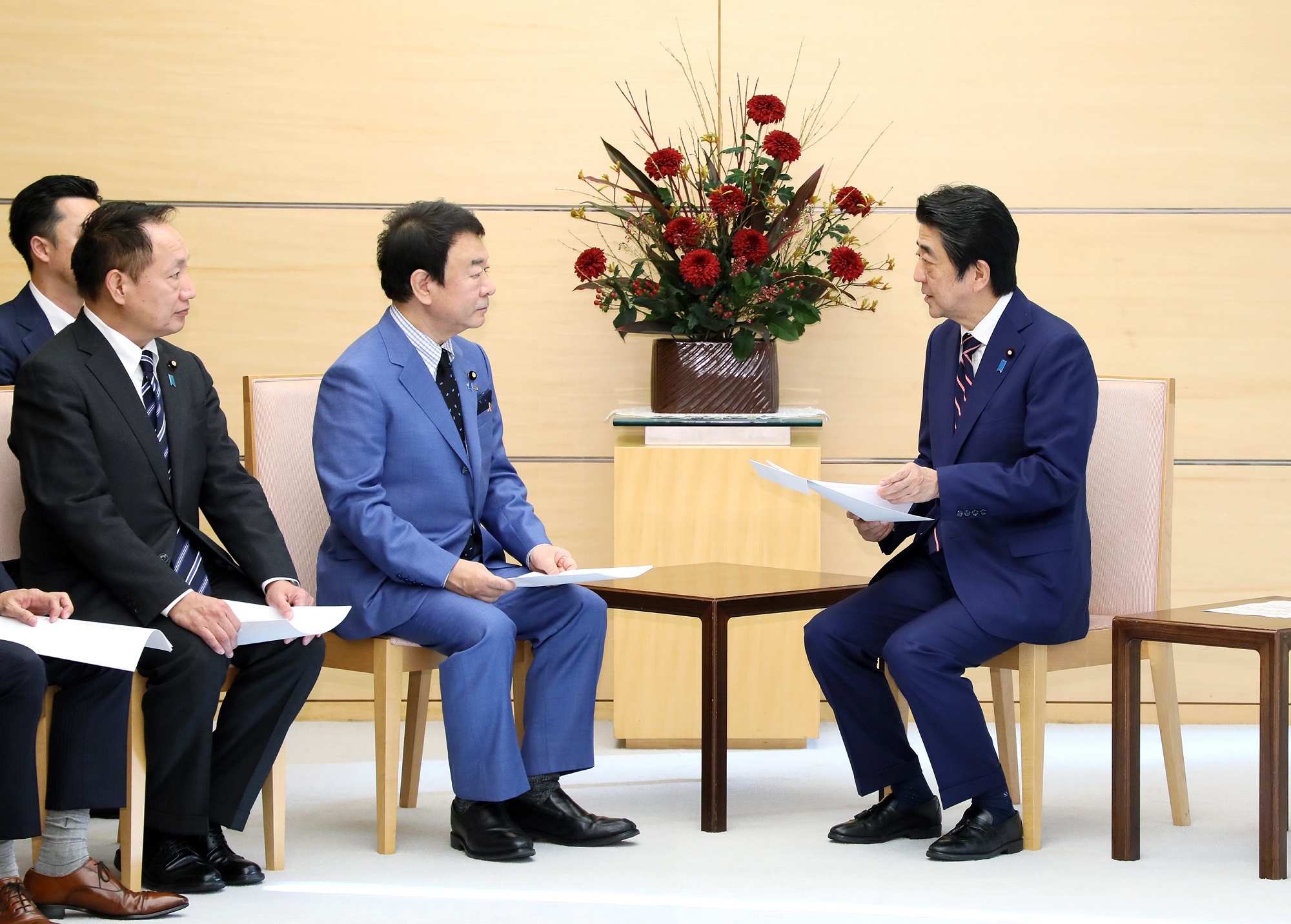 安倍总理在总理大臣官邸接收了日本尊严与国家利益保护会的建议。