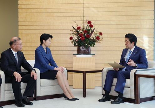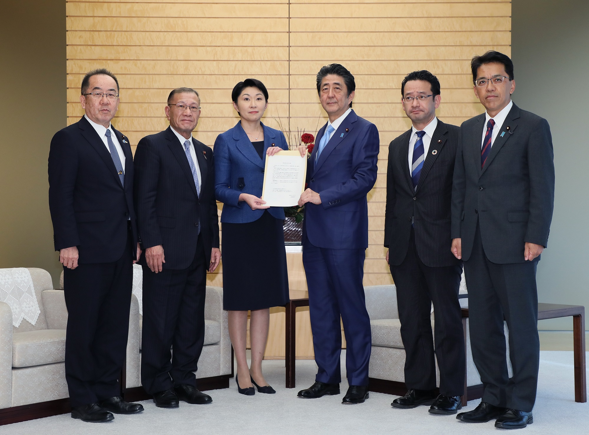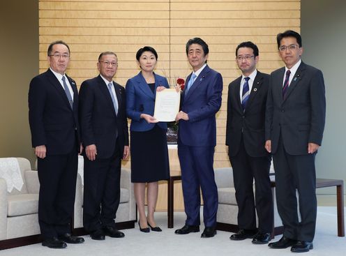 安倍总理在总理大臣官邸接收了自由民主党冲绳振兴调查会的建议。