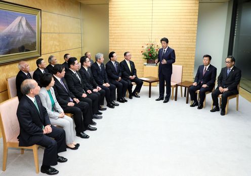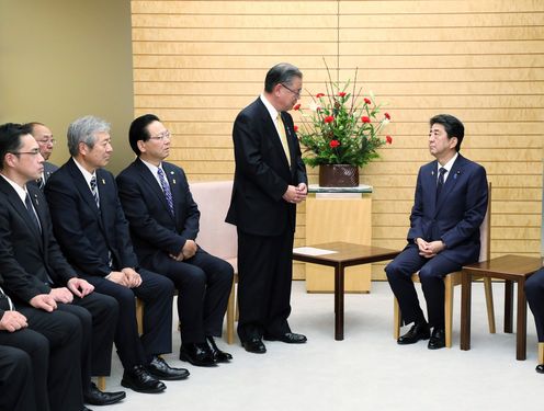 安倍总理在总理大臣官邸接受了北方领土邻接地区振兴对策根室管内市町联络协议会的拜访。