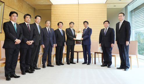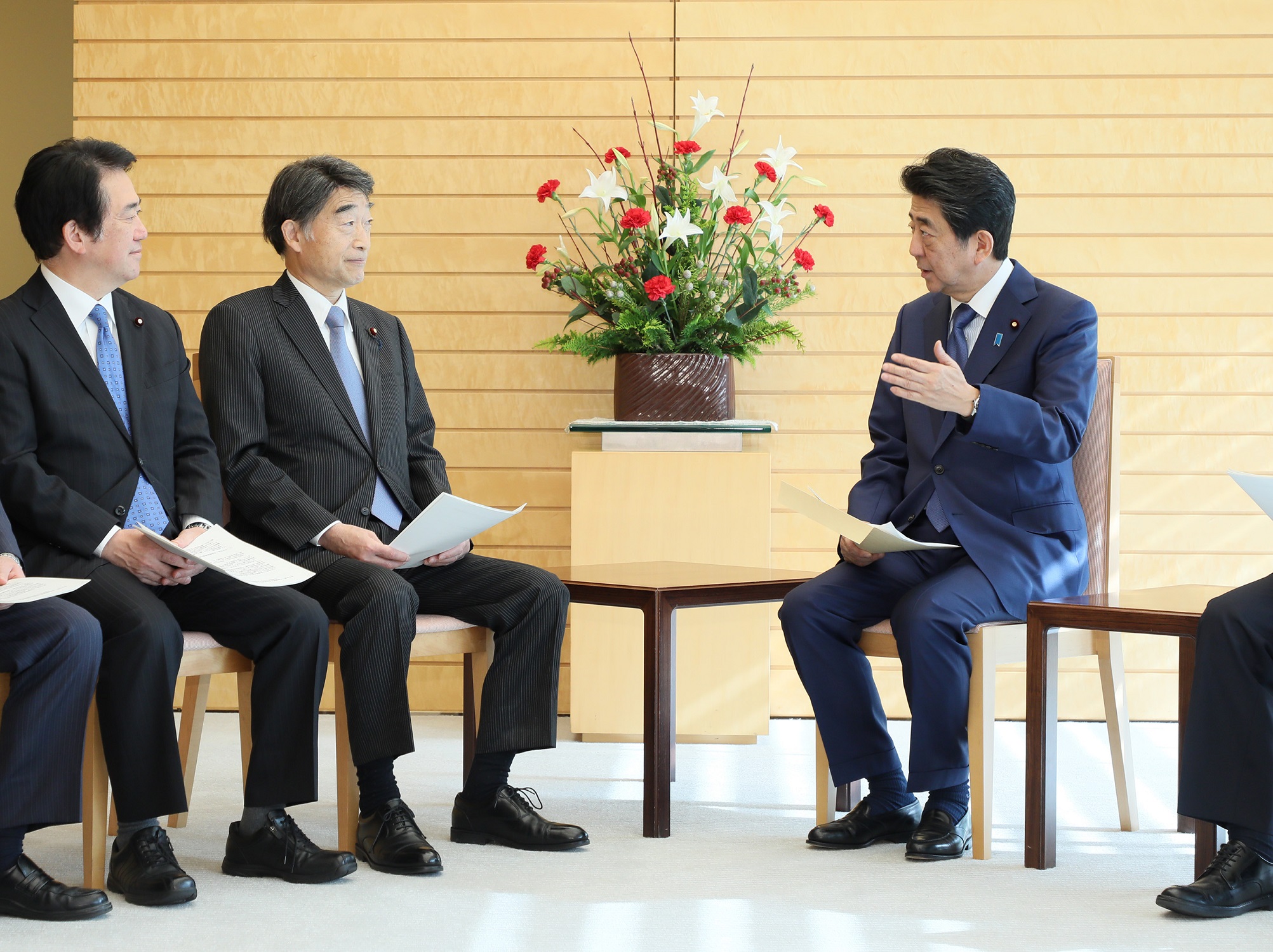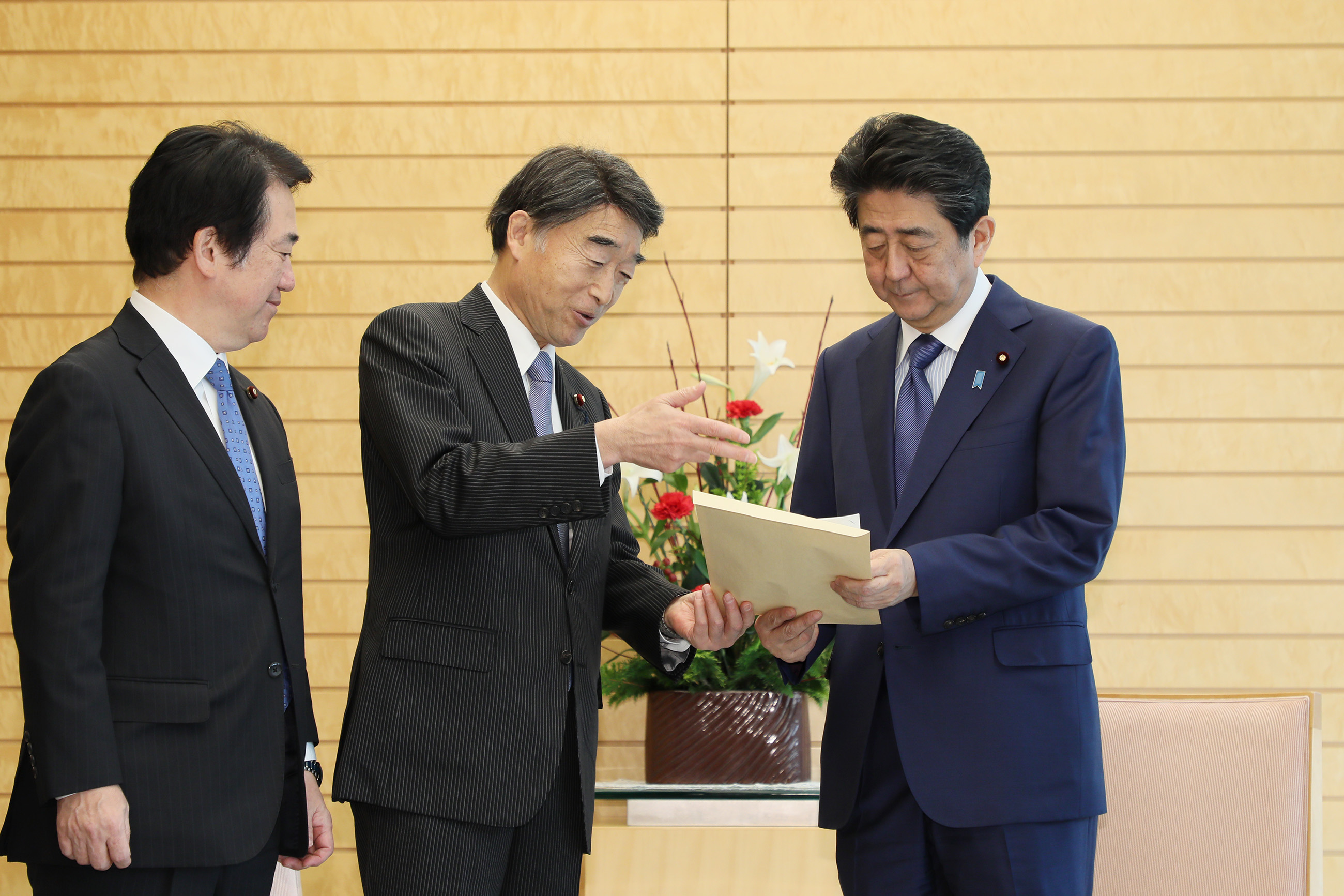 安倍总理在总理大臣官邸接收了自由民主党中小微企业政策调查会的建议。