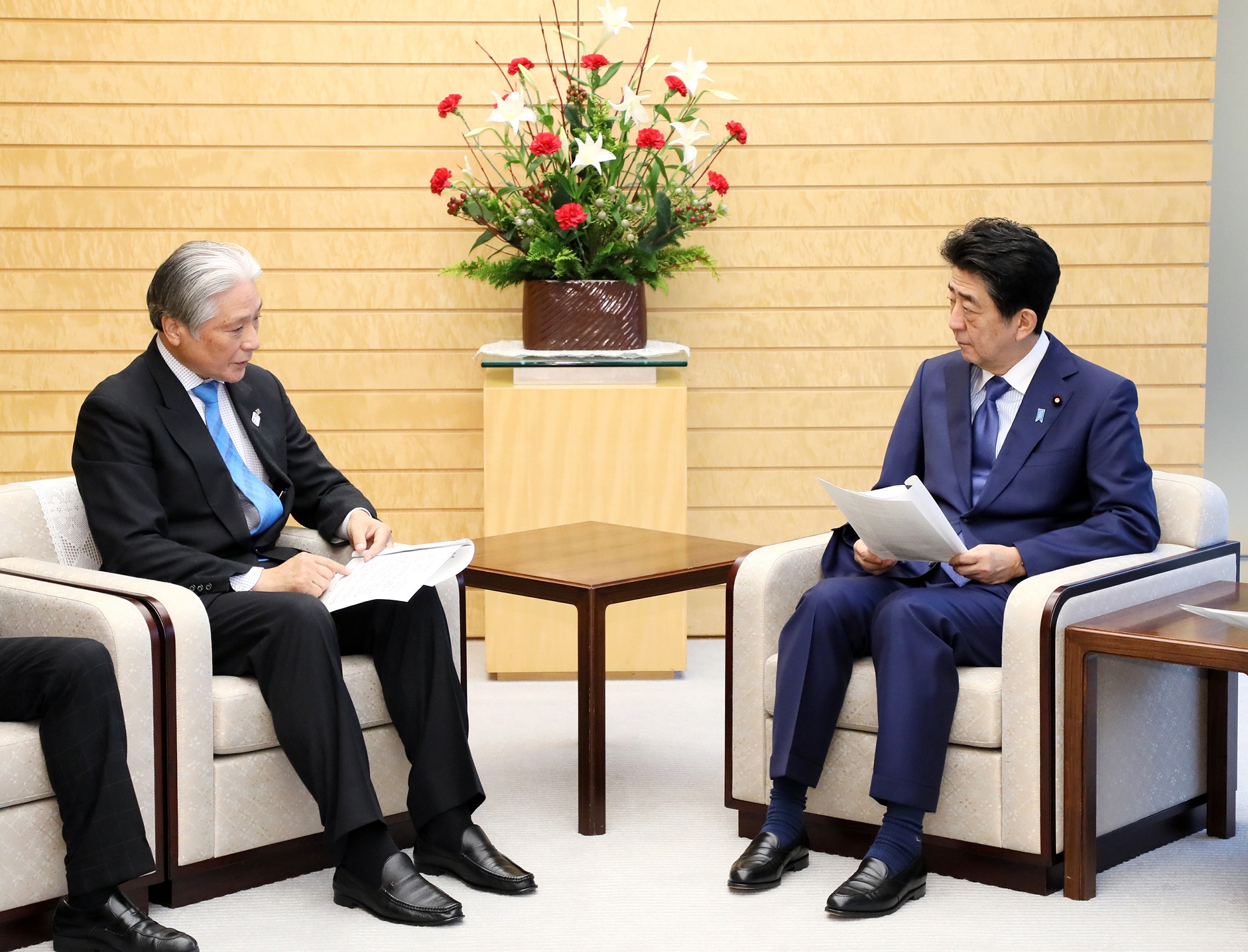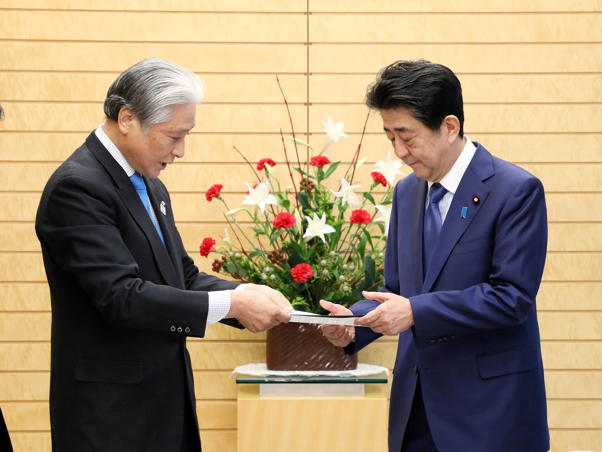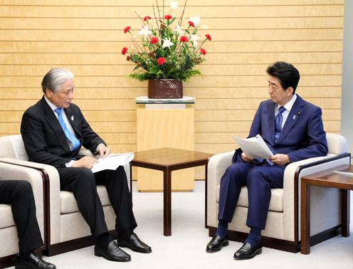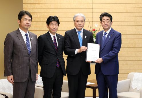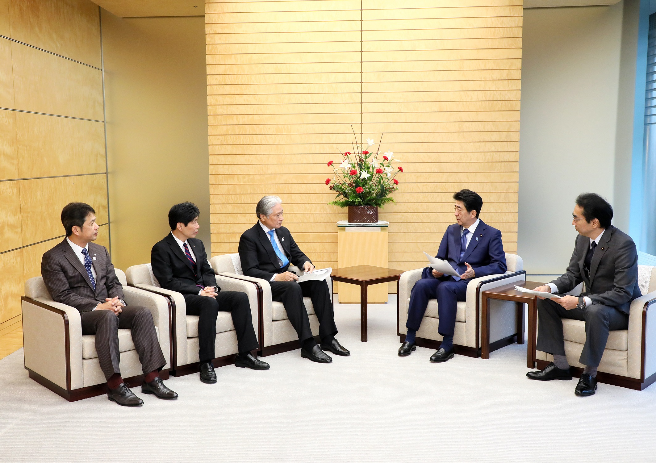 安倍总理在总理大臣官邸接受了栃木县知事福田富一、茨城县知事大井川和彦及群马县知事山本一太有关CSF(猪瘟)对策的拜访。