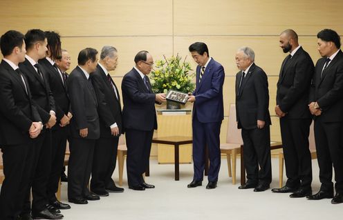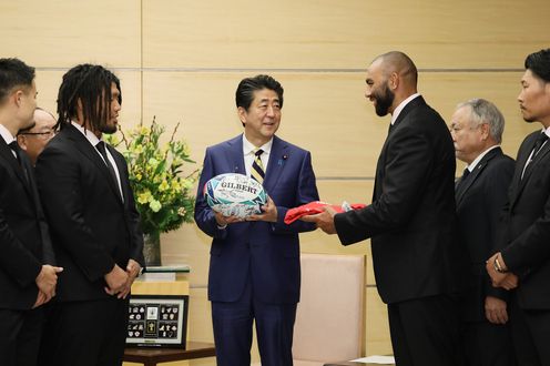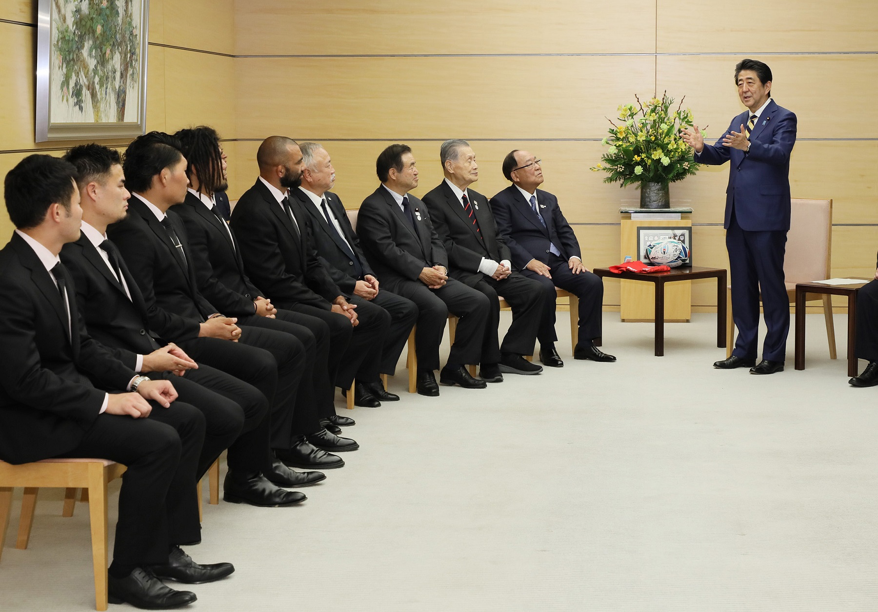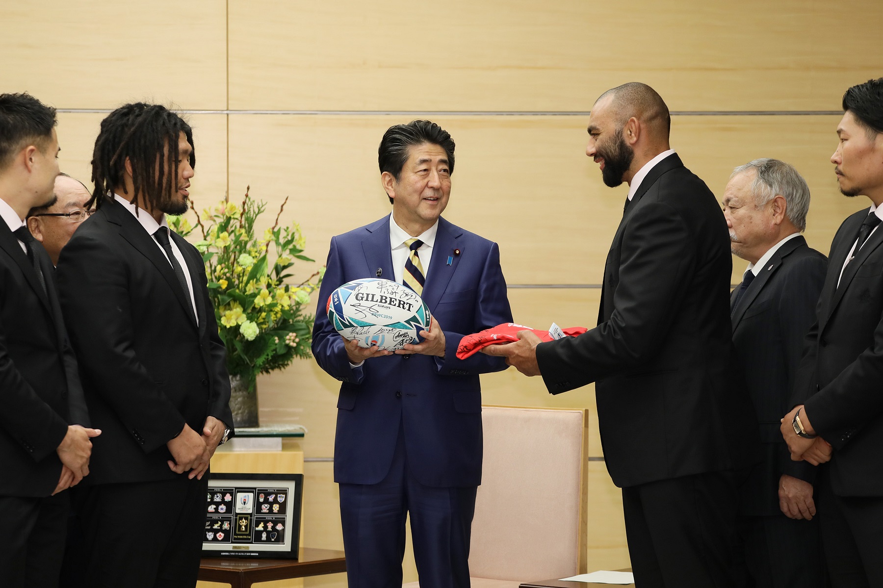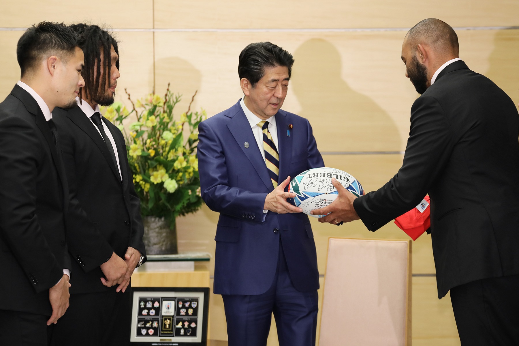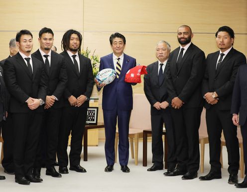 安倍总理在总理大臣官邸接受了2019年日本橄榄球世界杯赛日本代表选手等有关2019年日本橄榄球世界杯赛报告的拜访。