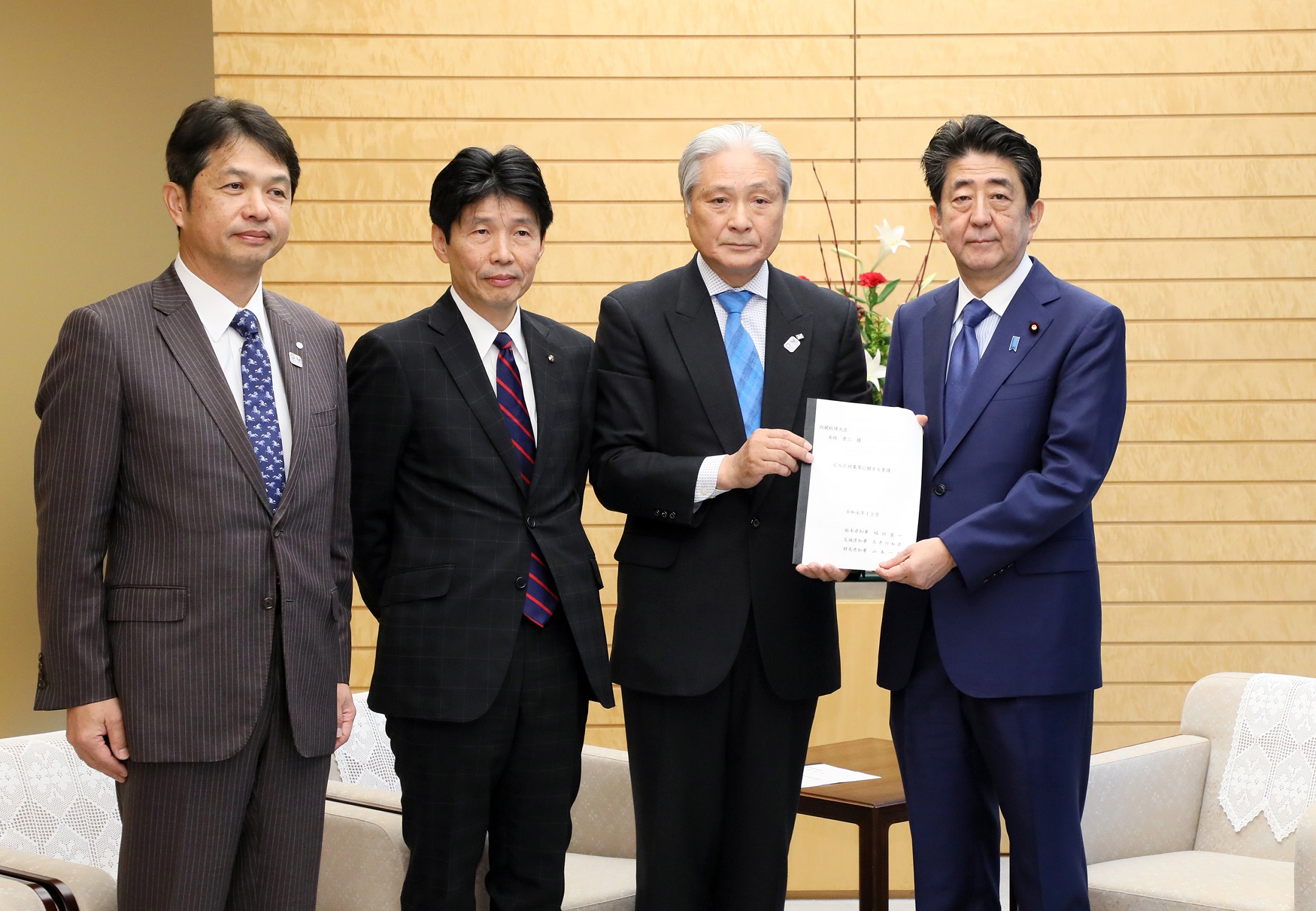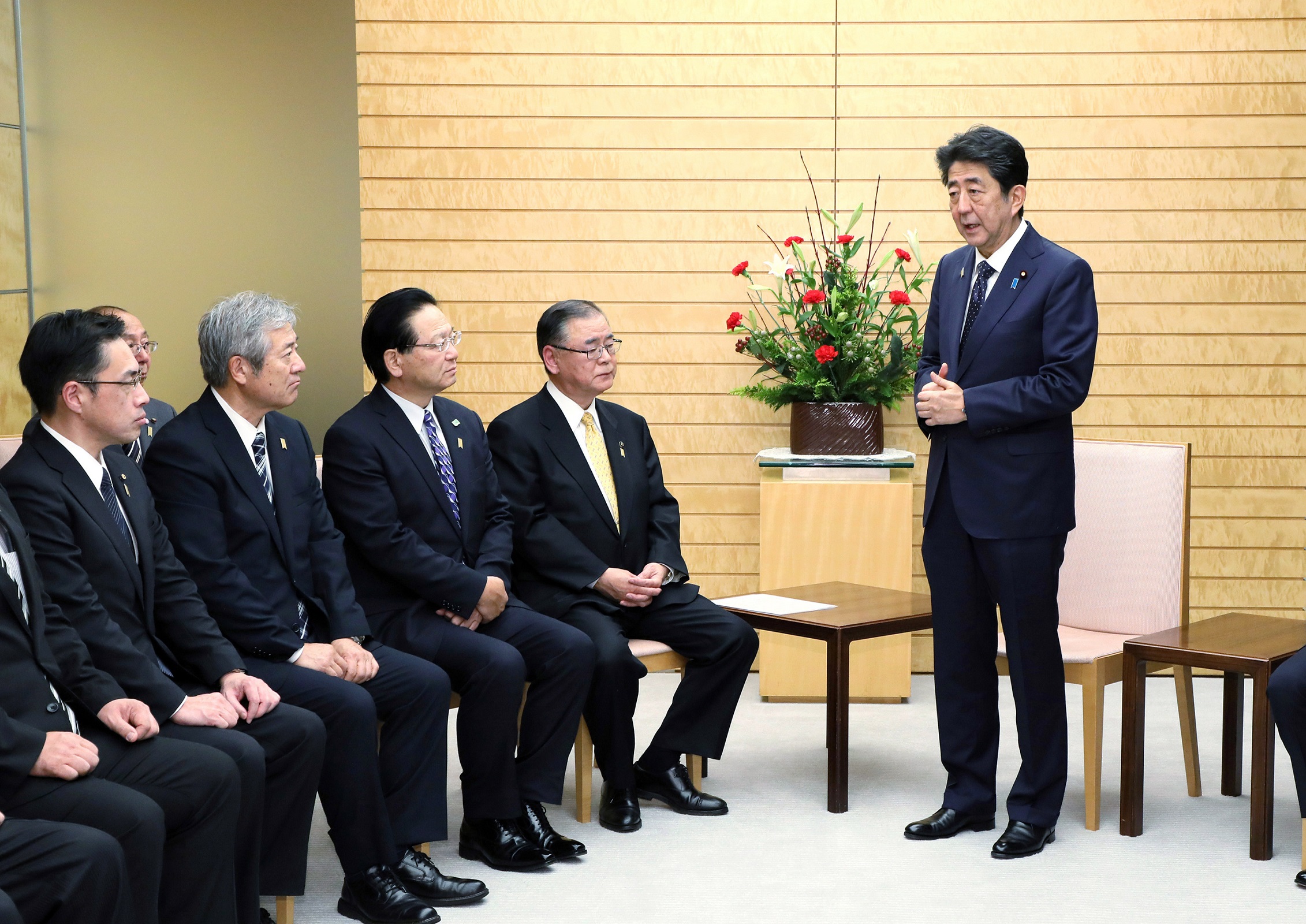 安倍总理在总理大臣官邸接受了北方领土邻接地区振兴对策根室管内市町联络协议会的拜访。