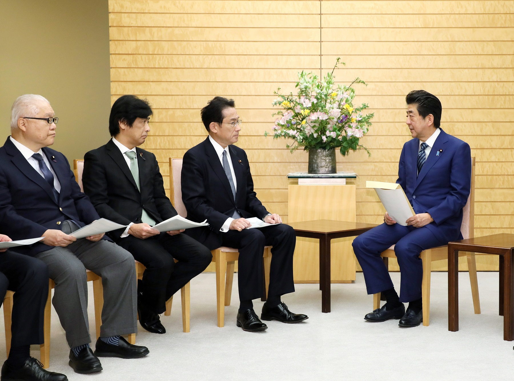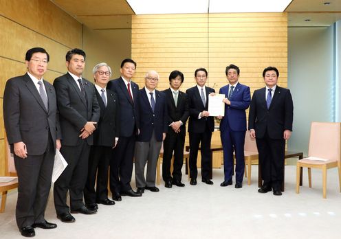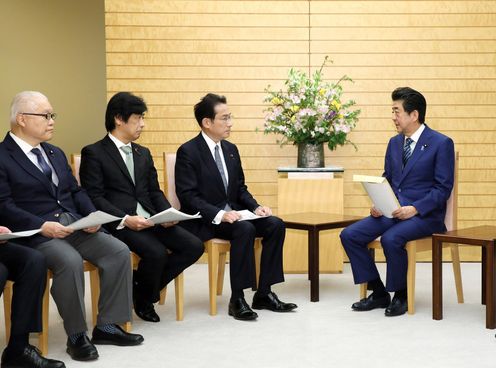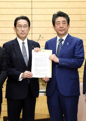 安倍总理在总理大臣官邸接收了自由民主党新型冠状病毒相关肺炎对策本部的建议。