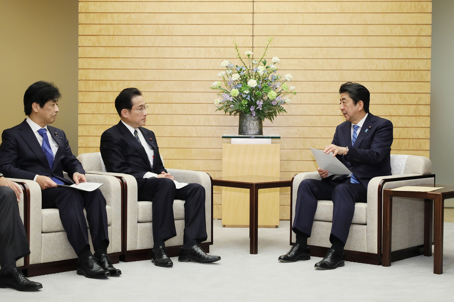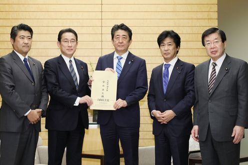 安倍总理在总理大臣官邸接收了自由民主党政务调查会经济成长战略本部及新型冠状病毒相关肺炎对策本部的建议。