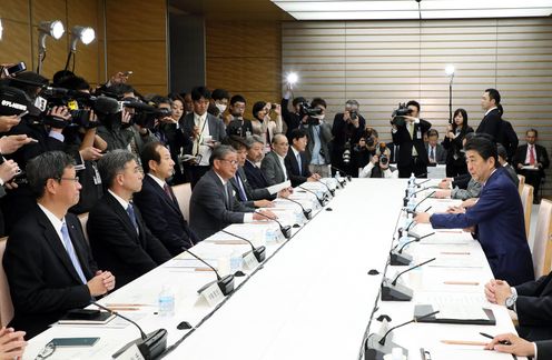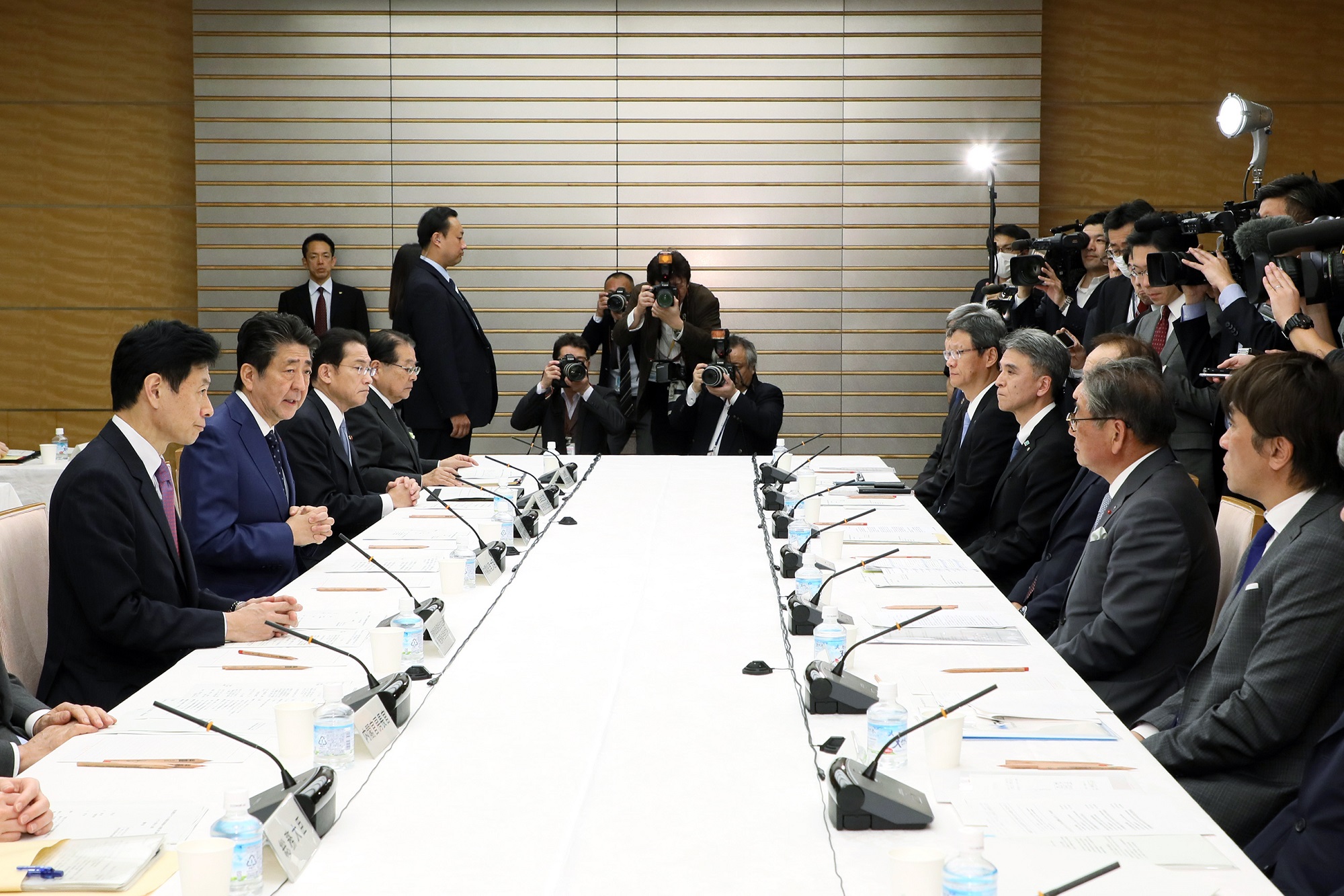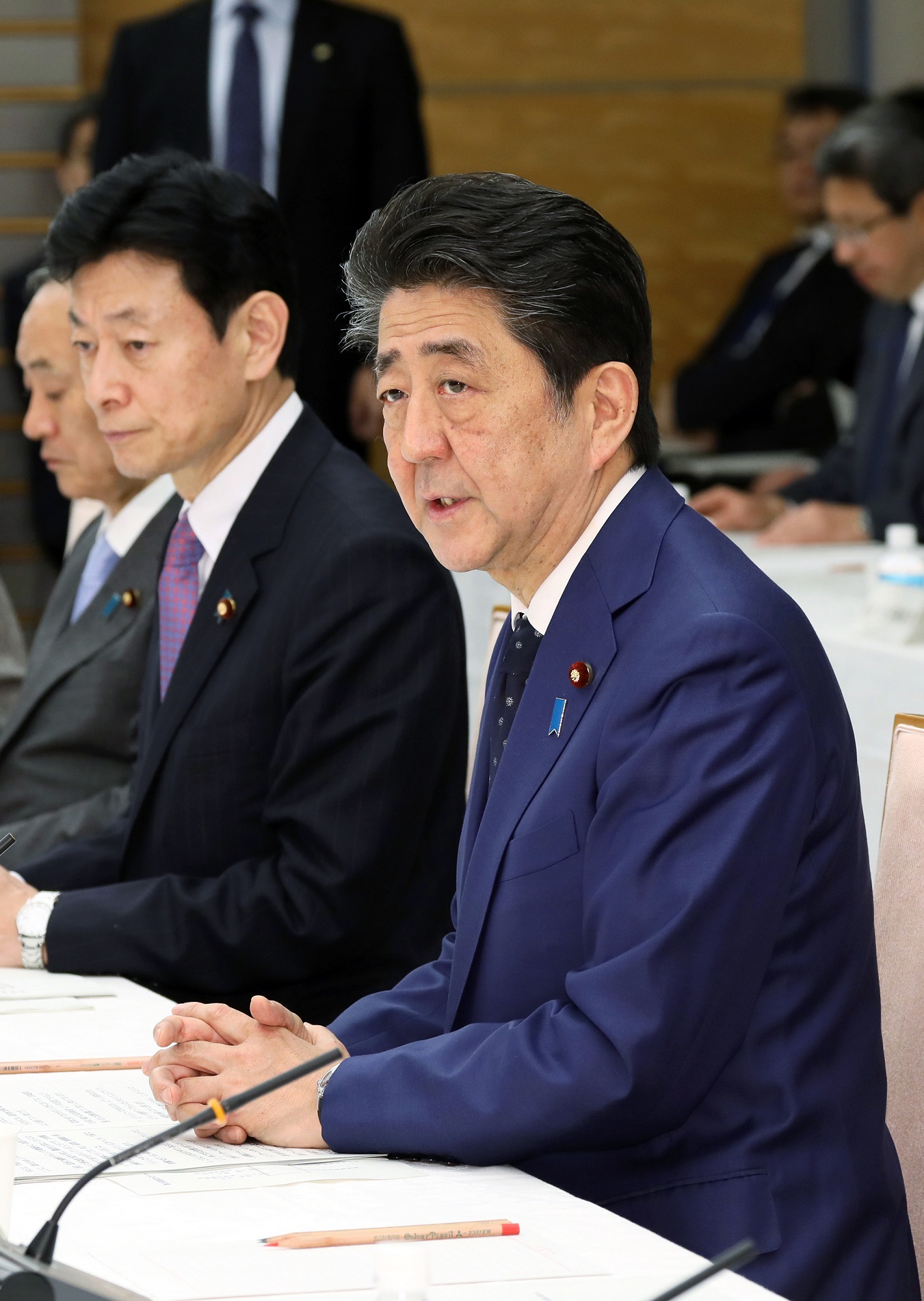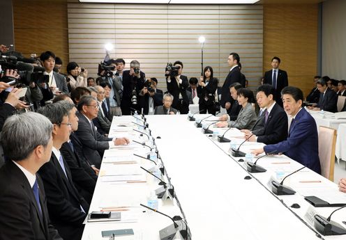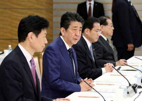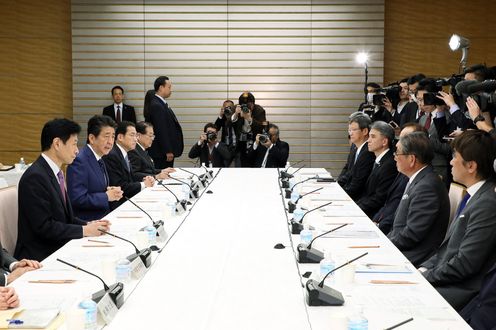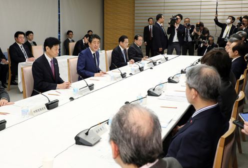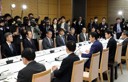安倍总理在总理大臣官邸出席了第5次有关新型冠状病毒感染症对实体经济影响情况的集中听取会议。