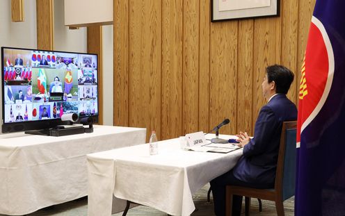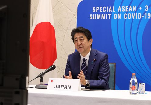 安倍总理在总理大臣官邸举行了与新型冠状病毒感染症相关的东盟和日中韩(ASEAN+3)特别首脑视频会议