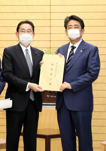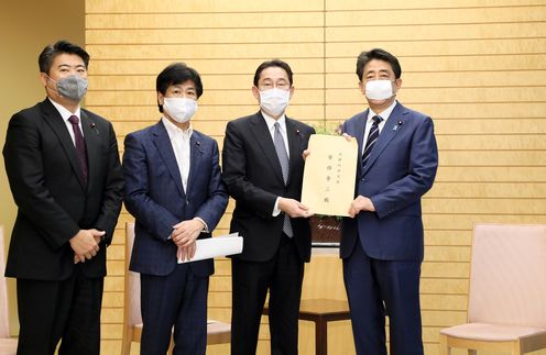 安倍总理在总理大臣官邸接收了自由民主党政务调查会的建议。
