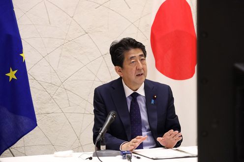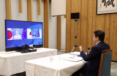 安倍总理在总理大臣官邸举行了日本欧盟首脑视频会议。