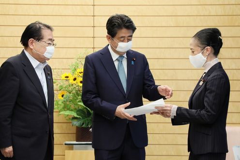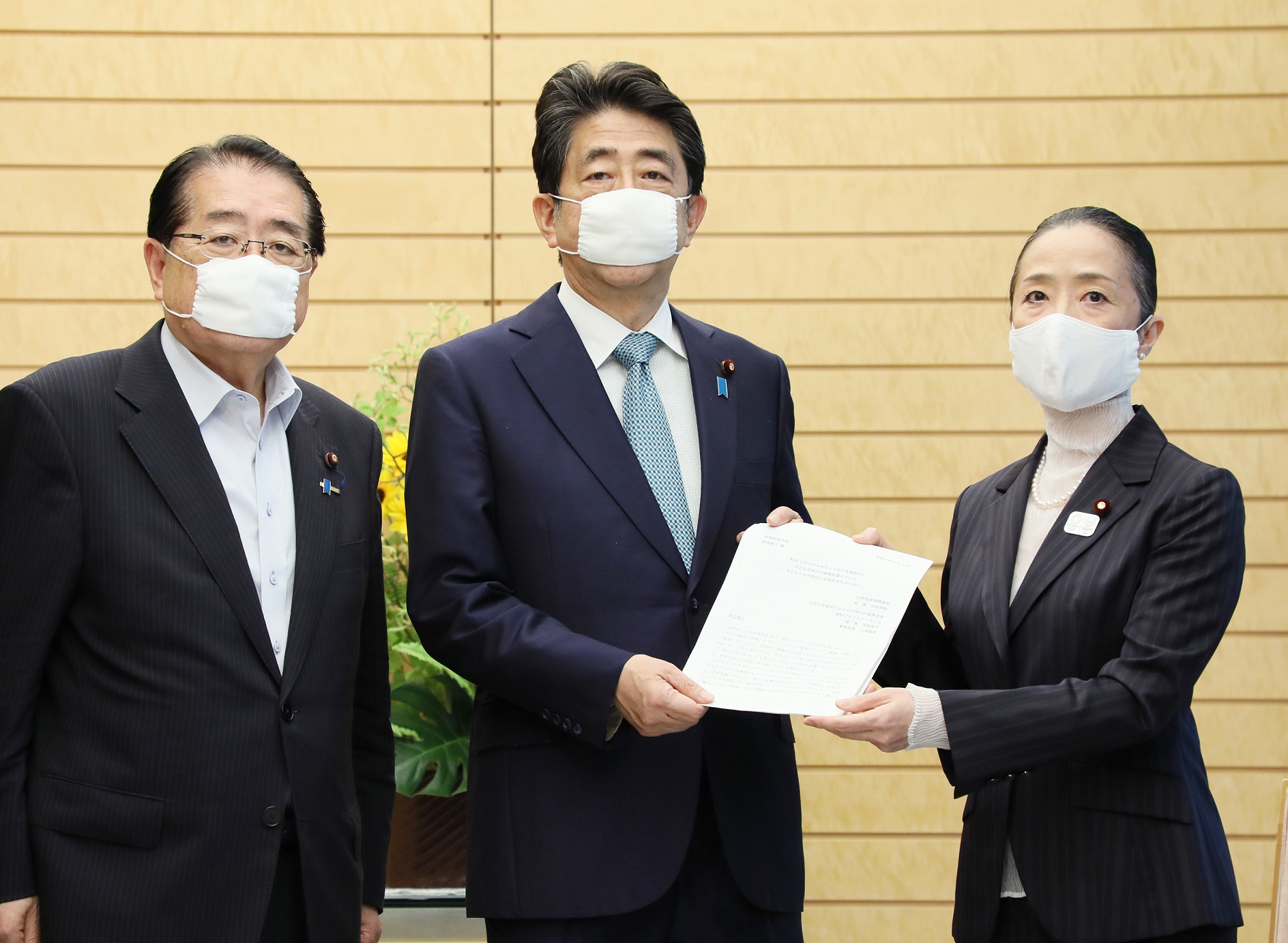 安倍总理在总理大臣官邸接收了公明党政务调查会包括9月入学在内的确保儿童学习支援探讨项目小组的建议。