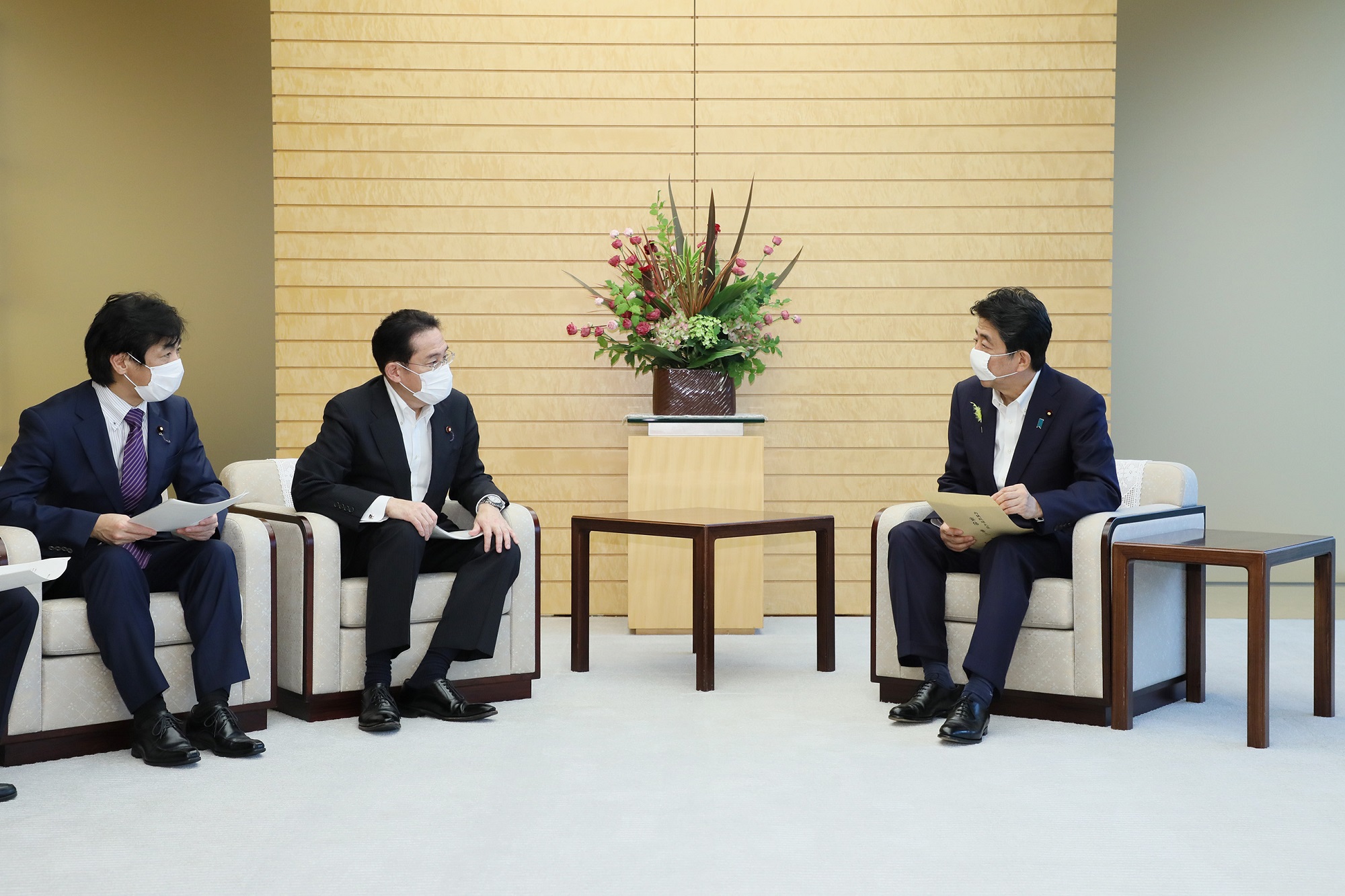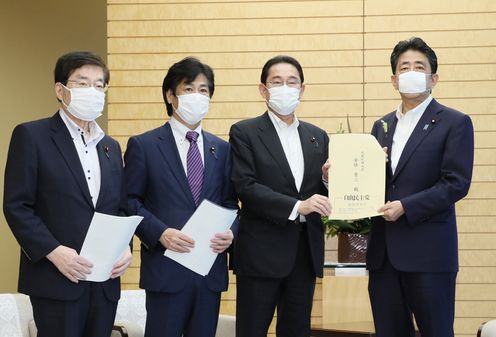 安倍总理在总理大臣官邸接收了自由民主党新型冠状病毒相关肺炎对策本部有关新型冠状病毒感染症对策的建议。
