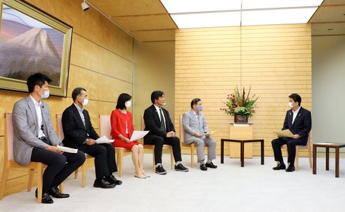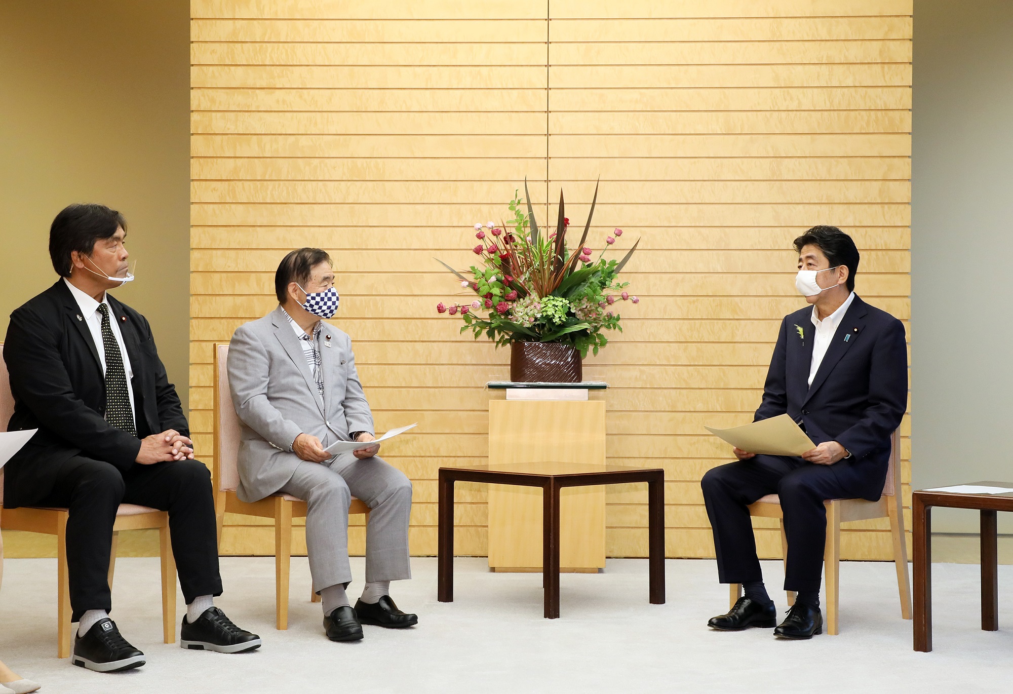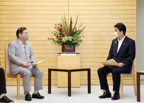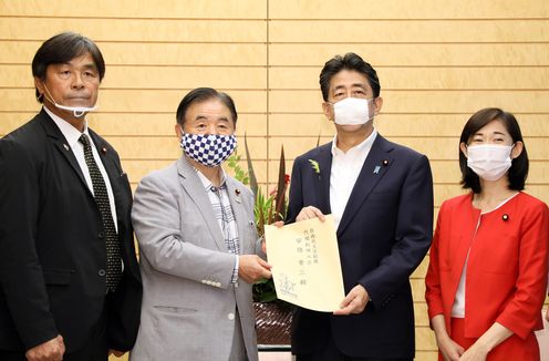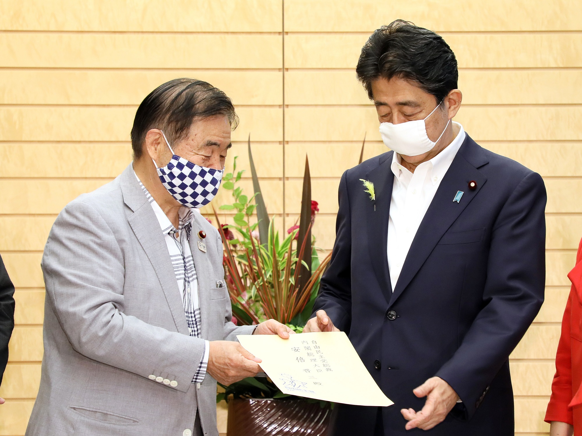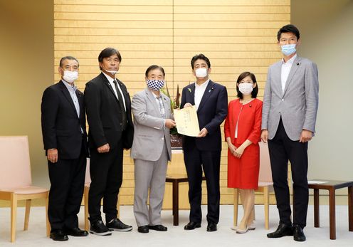安倍总理在总理大臣官邸接收了自由民主党2020年东京奥运会与残奥会实施本部的建议。