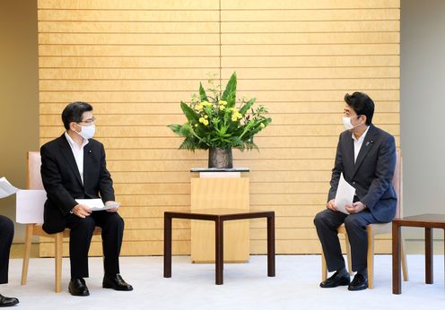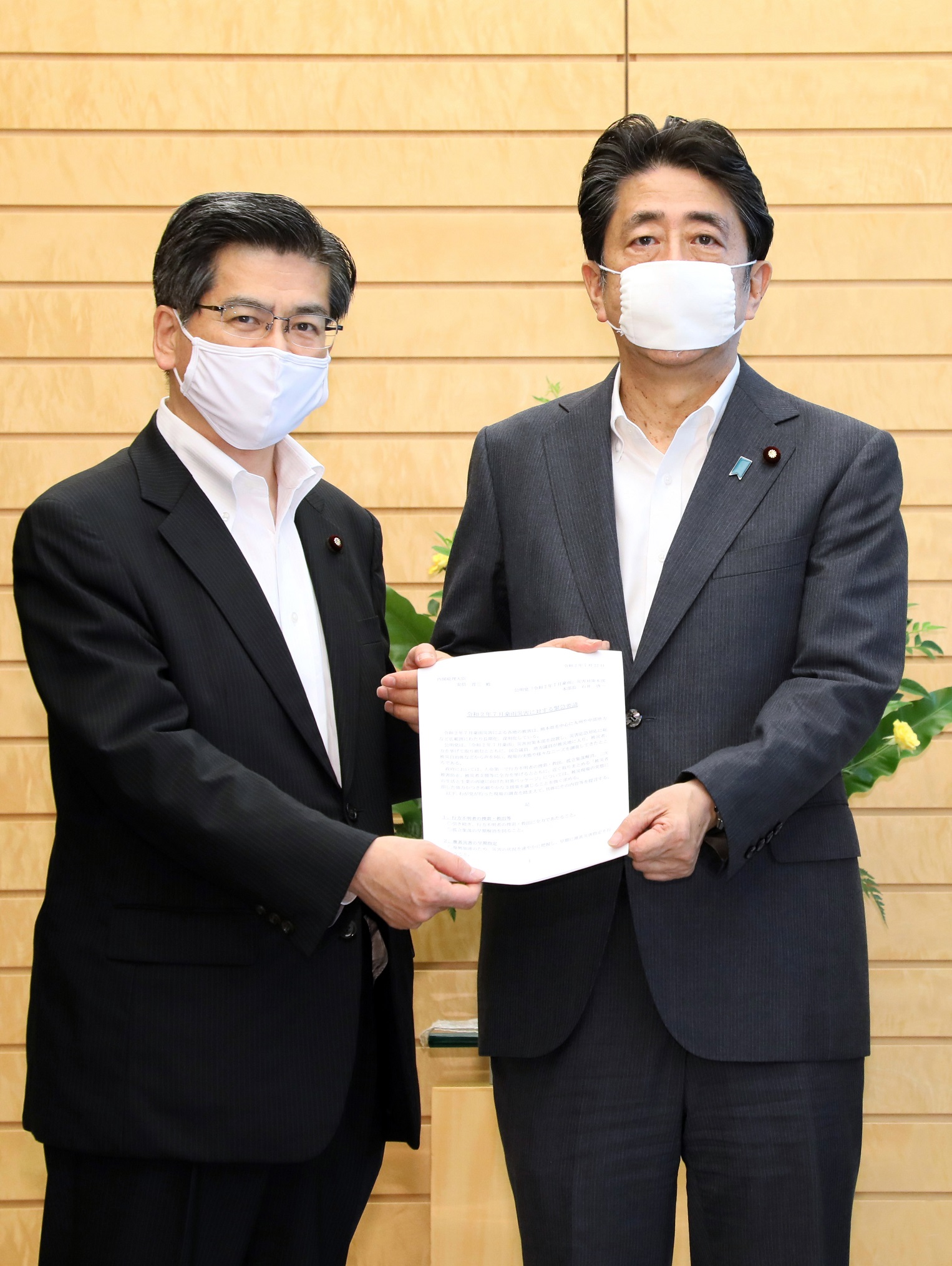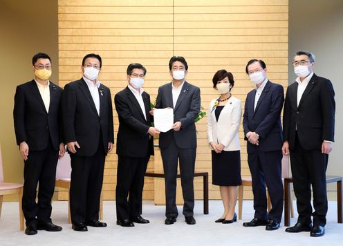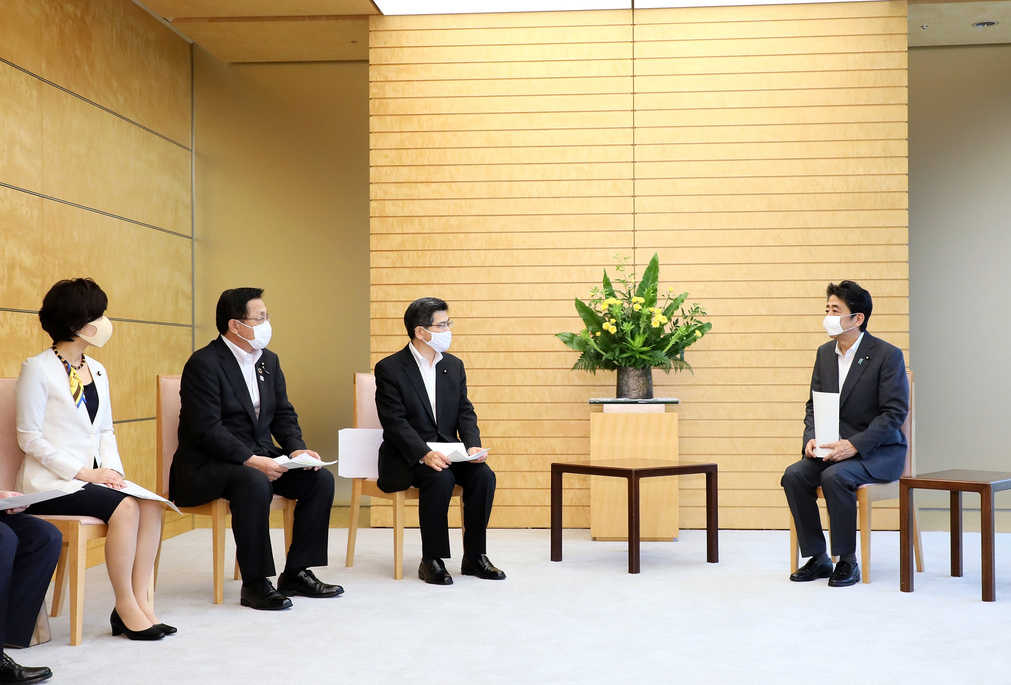 安倍总理在总理大臣官邸接收了公明党“2020年7月暴雨”灾害对策本部的建议。