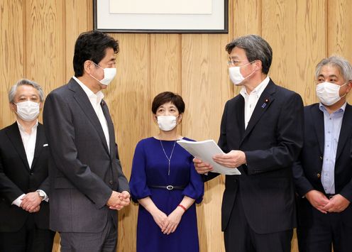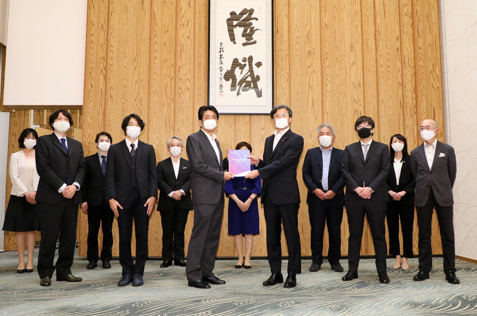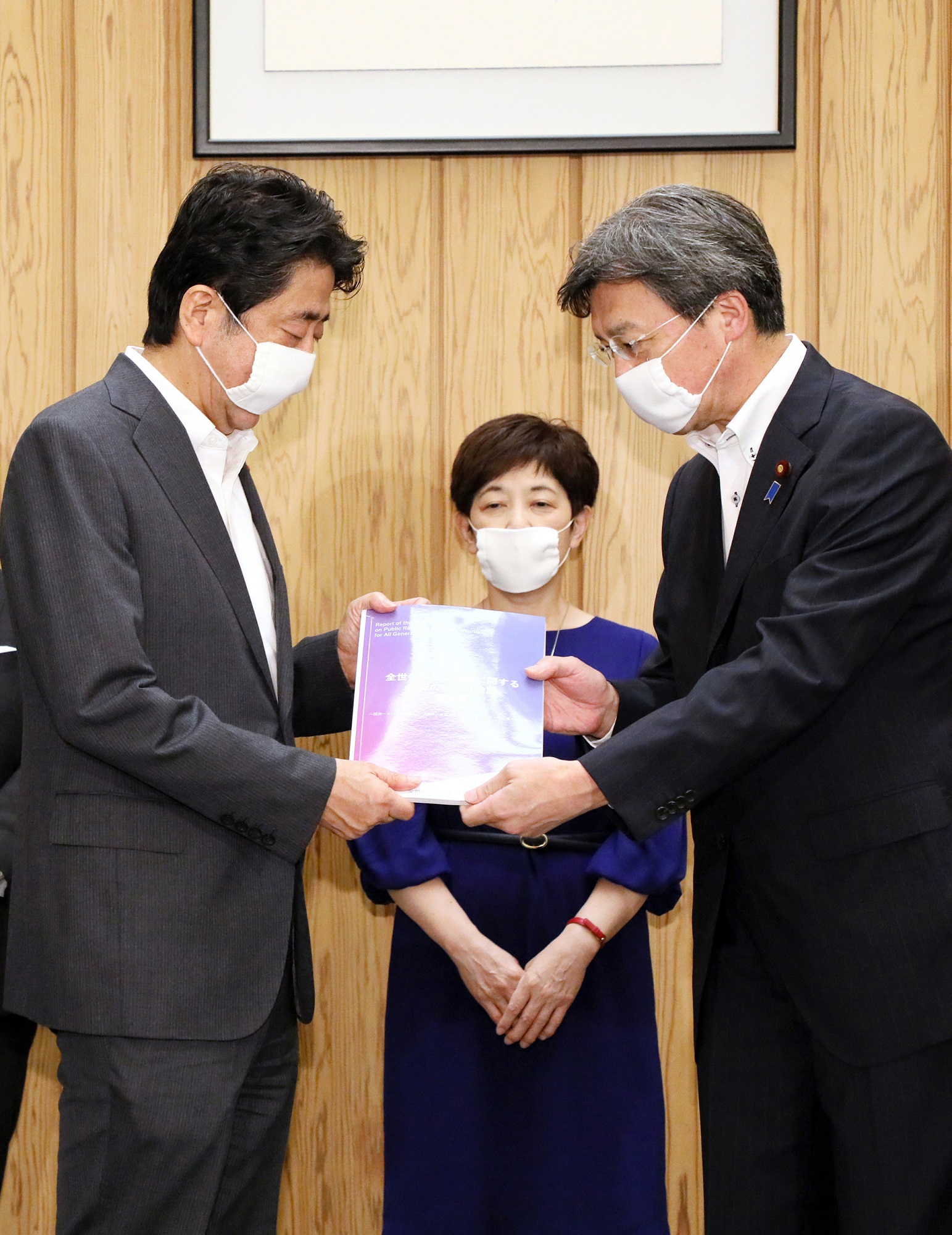 安倍总理在总理大臣官邸接收了有关全民型社会保障制度的宣传方式会议递交的报告书。