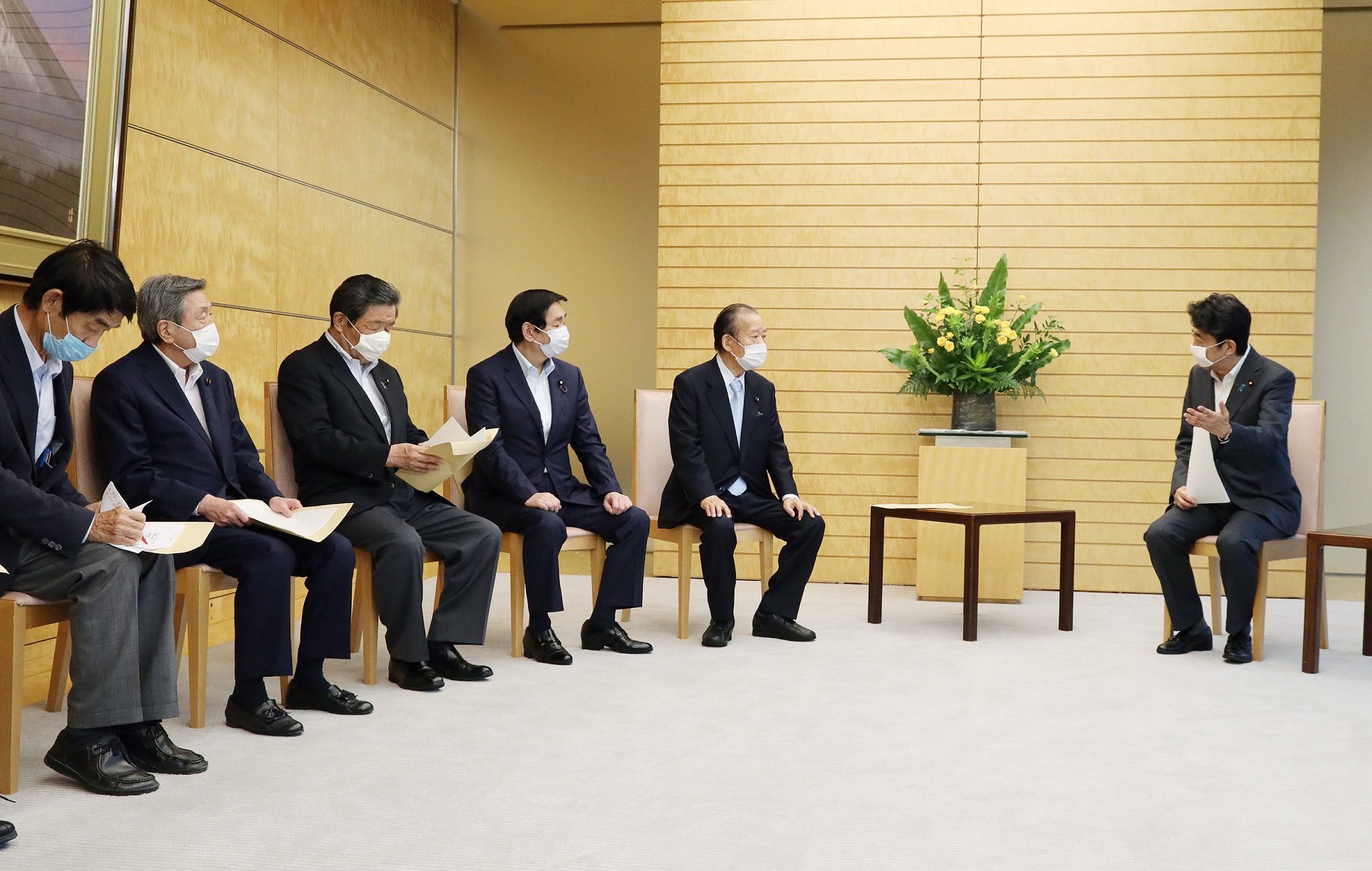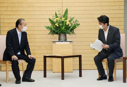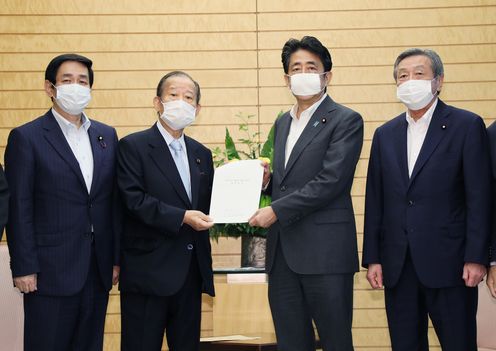 安倍总理在总理大臣官邸接收了自由民主党2020年暴雨灾害对策本部的建议。