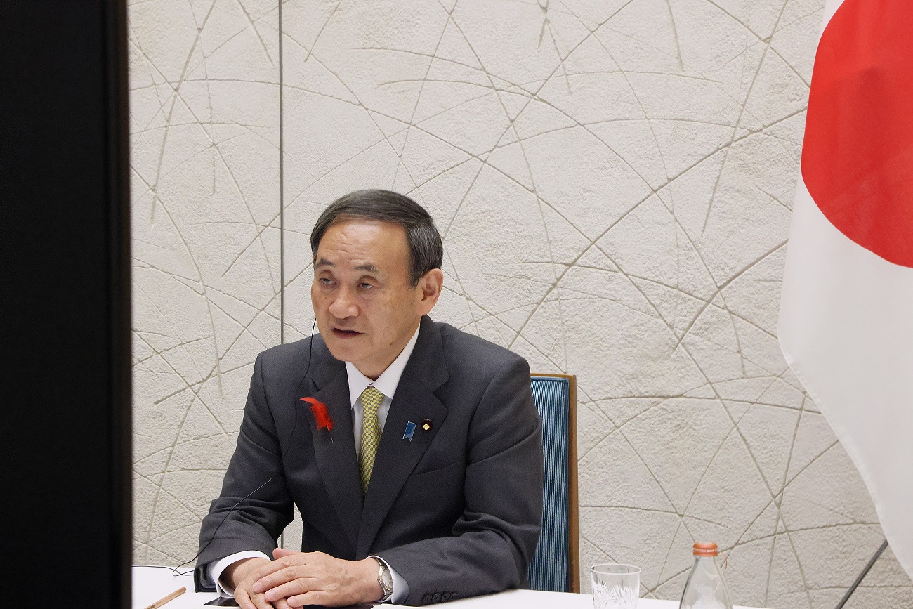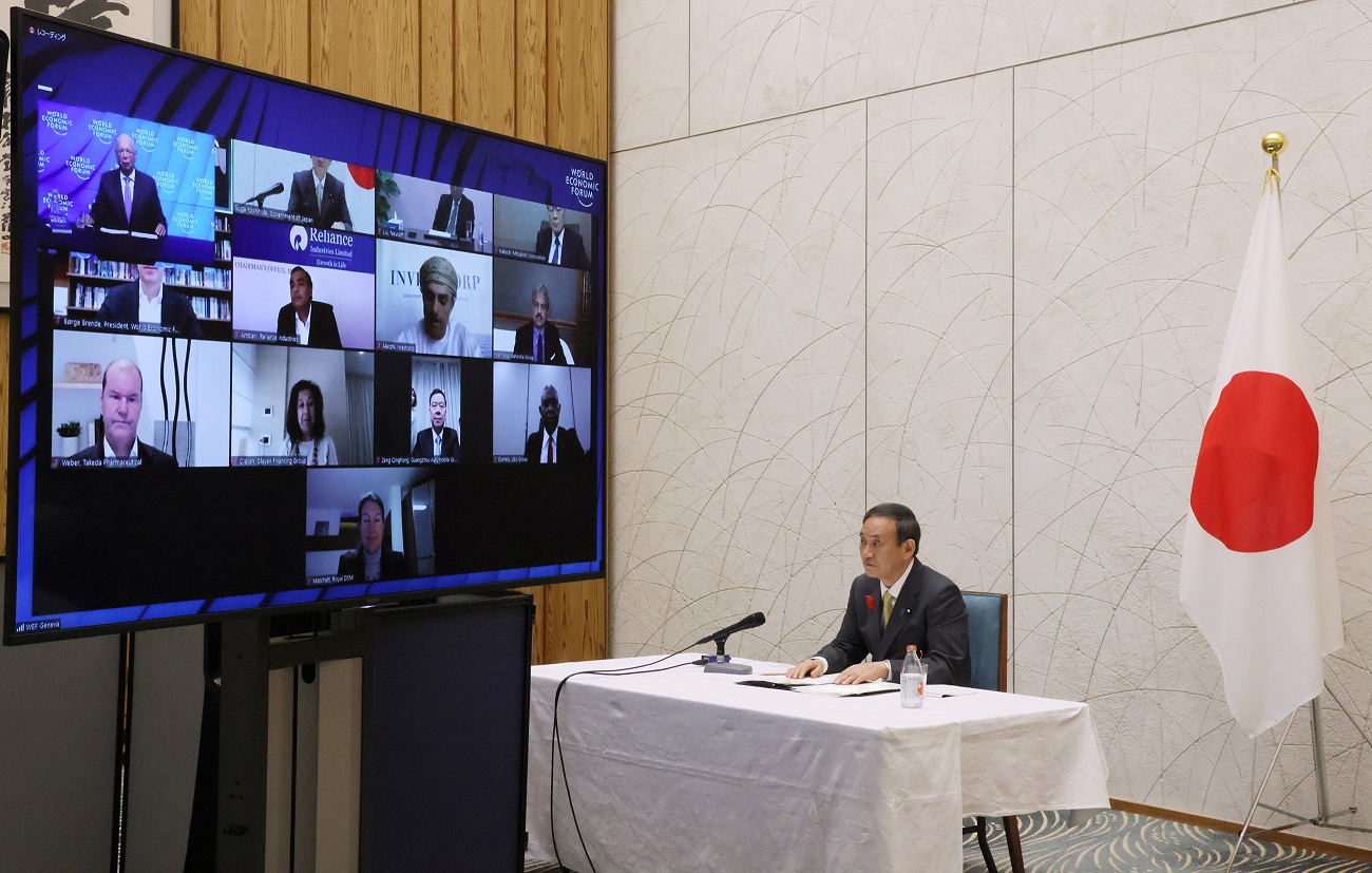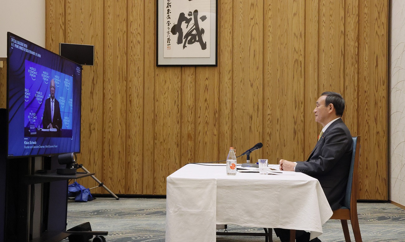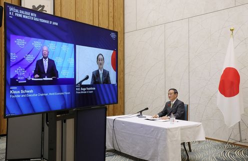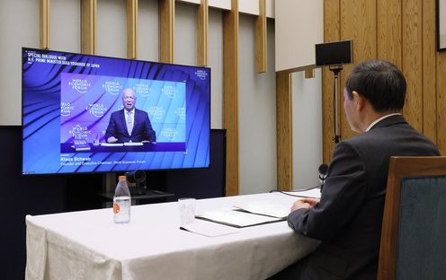 菅总理在总理大臣官邸与世界经济论坛主席克劳斯・施瓦布等举行了视频会议。